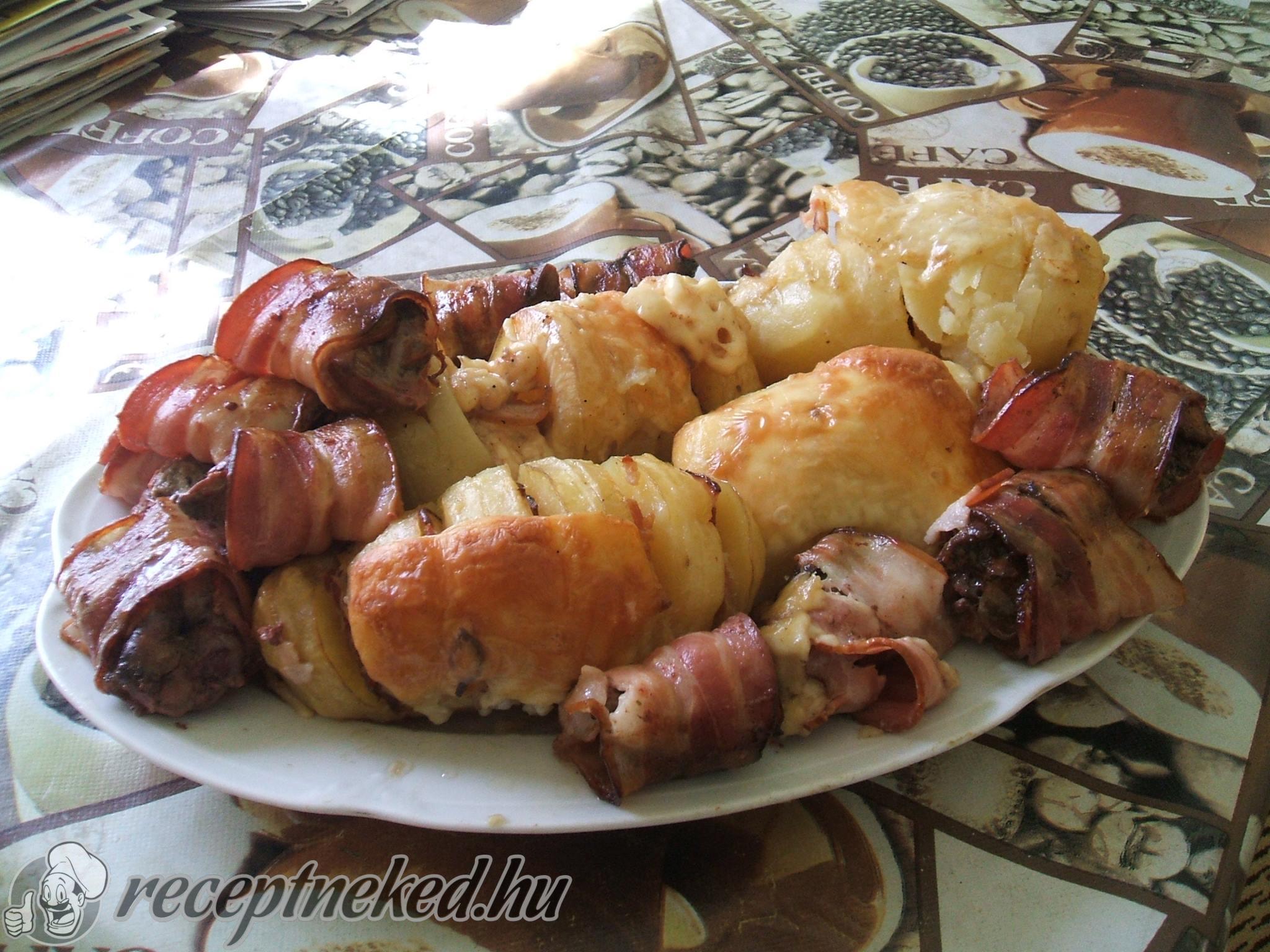 Tálaljuk a sült májat és almát hasábburgonyával, kicsit meglocsolva a fokhagymás-rozmaringos öntettel.