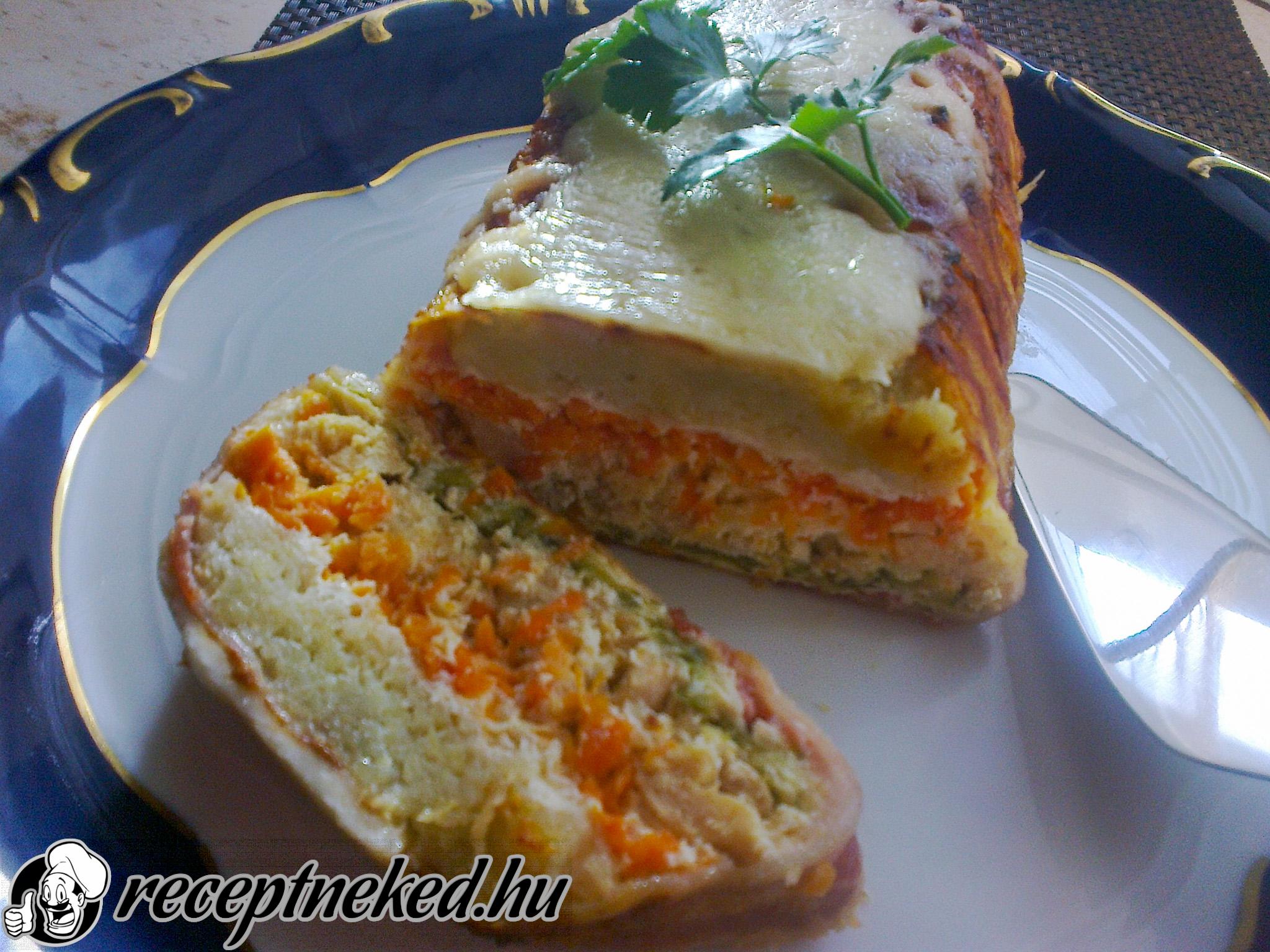Elkezdjük a rétegezést. A a szalonnára a kinyomkodott, sózott, reszelt burgonyát tesszük, melyet tejfölös a öntettel meglocsolunk, erre jön a sárgarépa, szintén öntet, erre kerülnek az elősütött csirkemell darabok, öntet, sózott kinyomkodott reszelt cukkini, végül a tejfölös öntettel zárjuk.