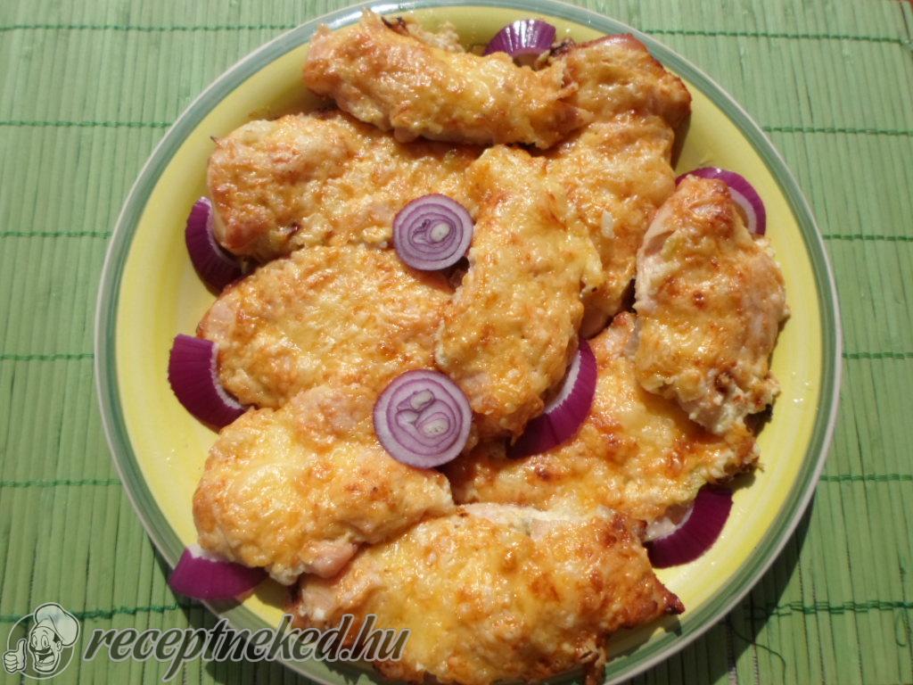 Sajtmasszát a húsra kanalazzuk, reszelt sajttal megszórjuk kevés zsemlemorzsával és vajdarabokkal és addig sütjük, amíg a sajt szépen megpirul rajt.