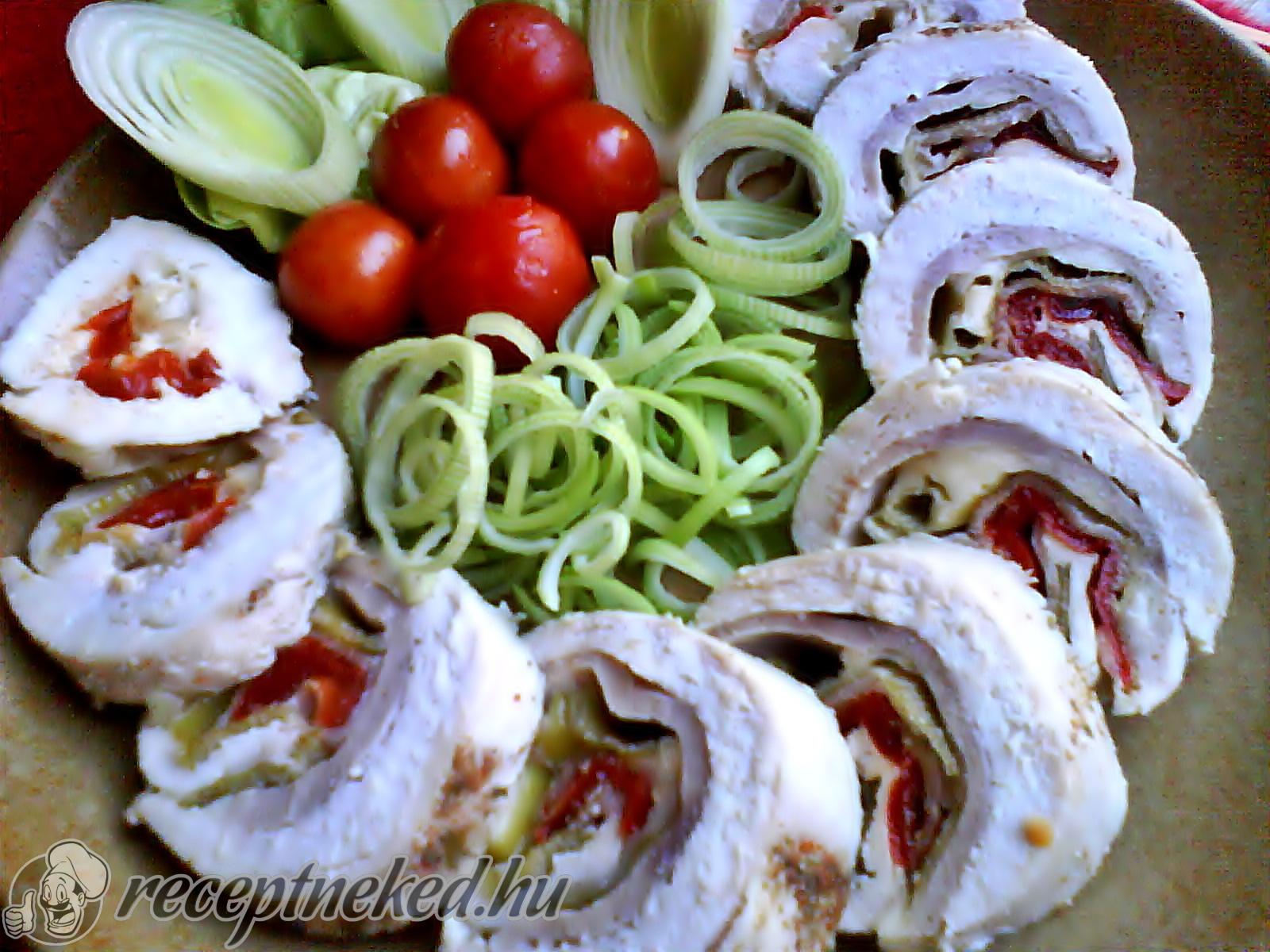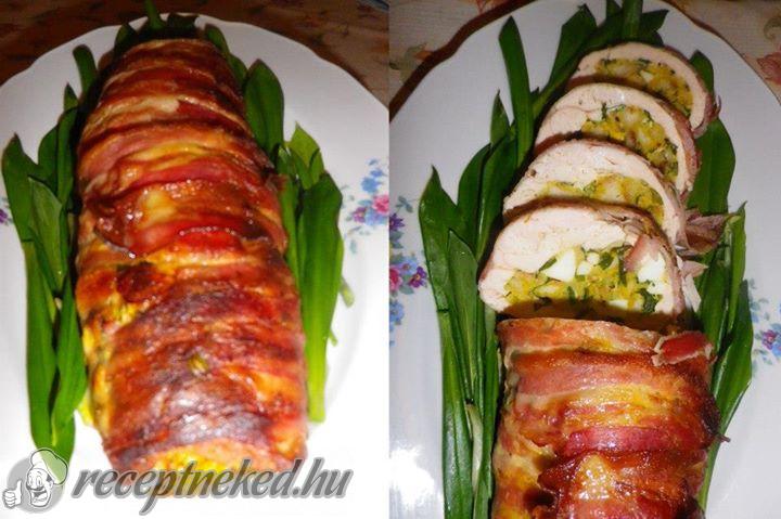 A csalánt elsimítom a hússzeleteken és óvatosan feltekerem, majd cérnával összekötöm, hogy a töltelék ne tudjon kifolyni belőle.