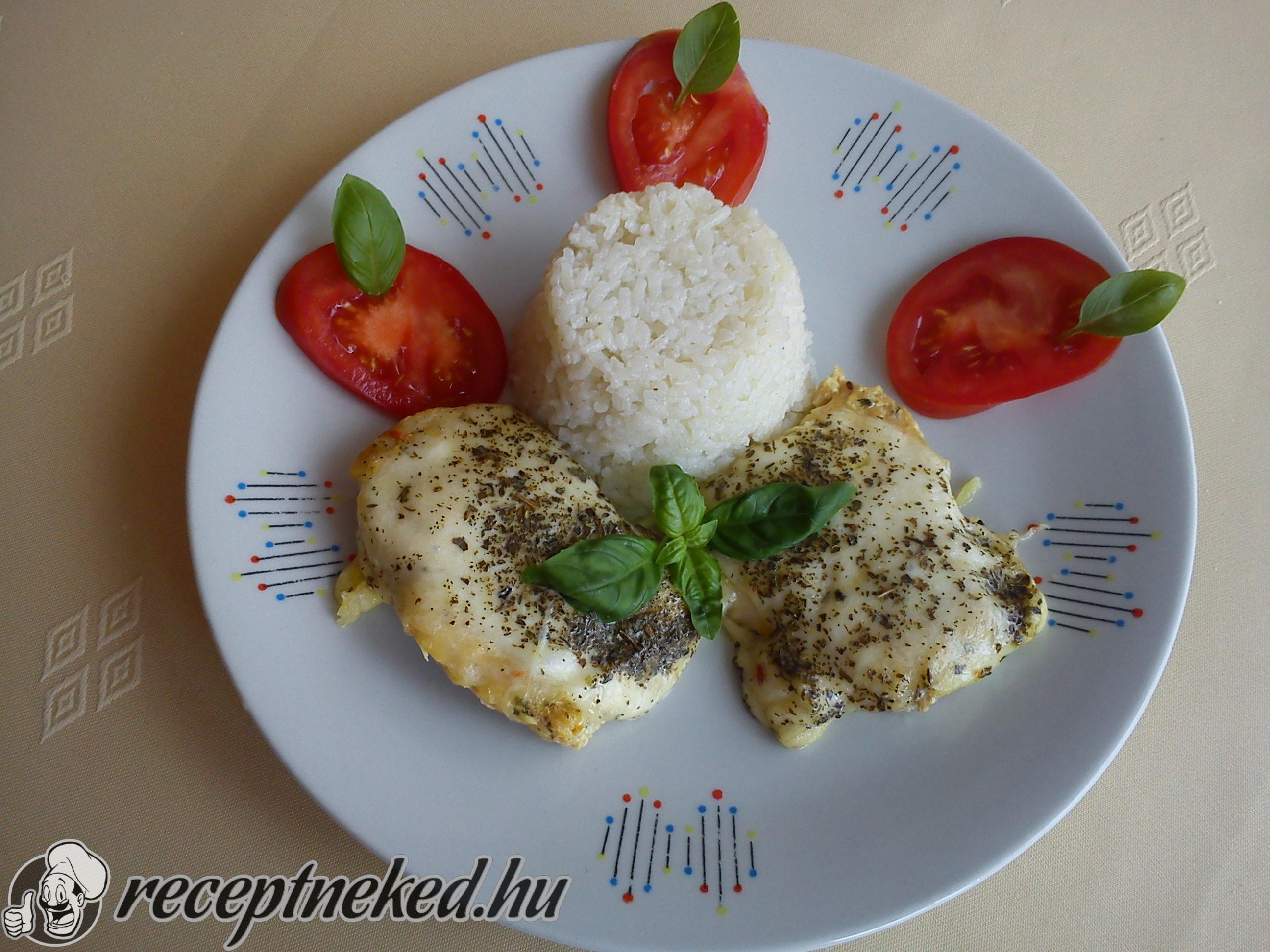 Alufóliával lefedjük, és előmelegített sütőbe tesszük. Miután megpárolódott, kb. 15 percig tovább sütjük, majd a bazsalikommal megszórt mozzarella szeleteket a csirkehúsra helyezzük és néhány perc alatt ráolvasztjuk.