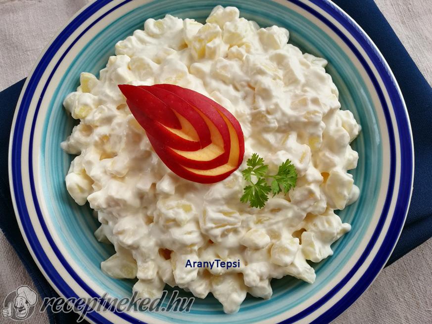 A hozzávalókat aprítjuk, kockázzuk és egy tálban elkeverjük. Fűszerezzük ízlés szerint, majd hozzákeverjük a majonézet.