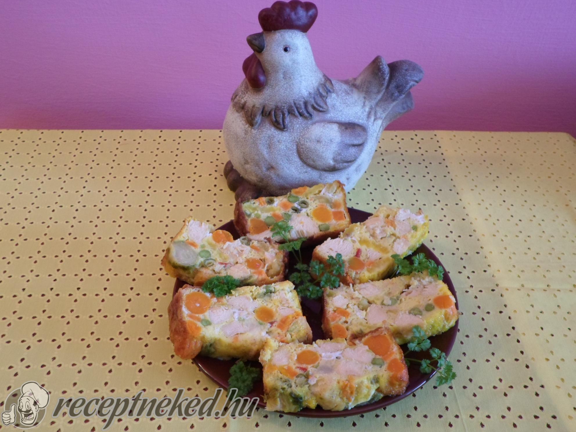 Kivajazott, 1 ek zsemlemorzsával meghintett sütőformába öntjük a csirkével összekevert zöldségeket és a felkockázott paprikákat. Ráöntjük a felveret tojásokat és óvatosan elkeverjük.