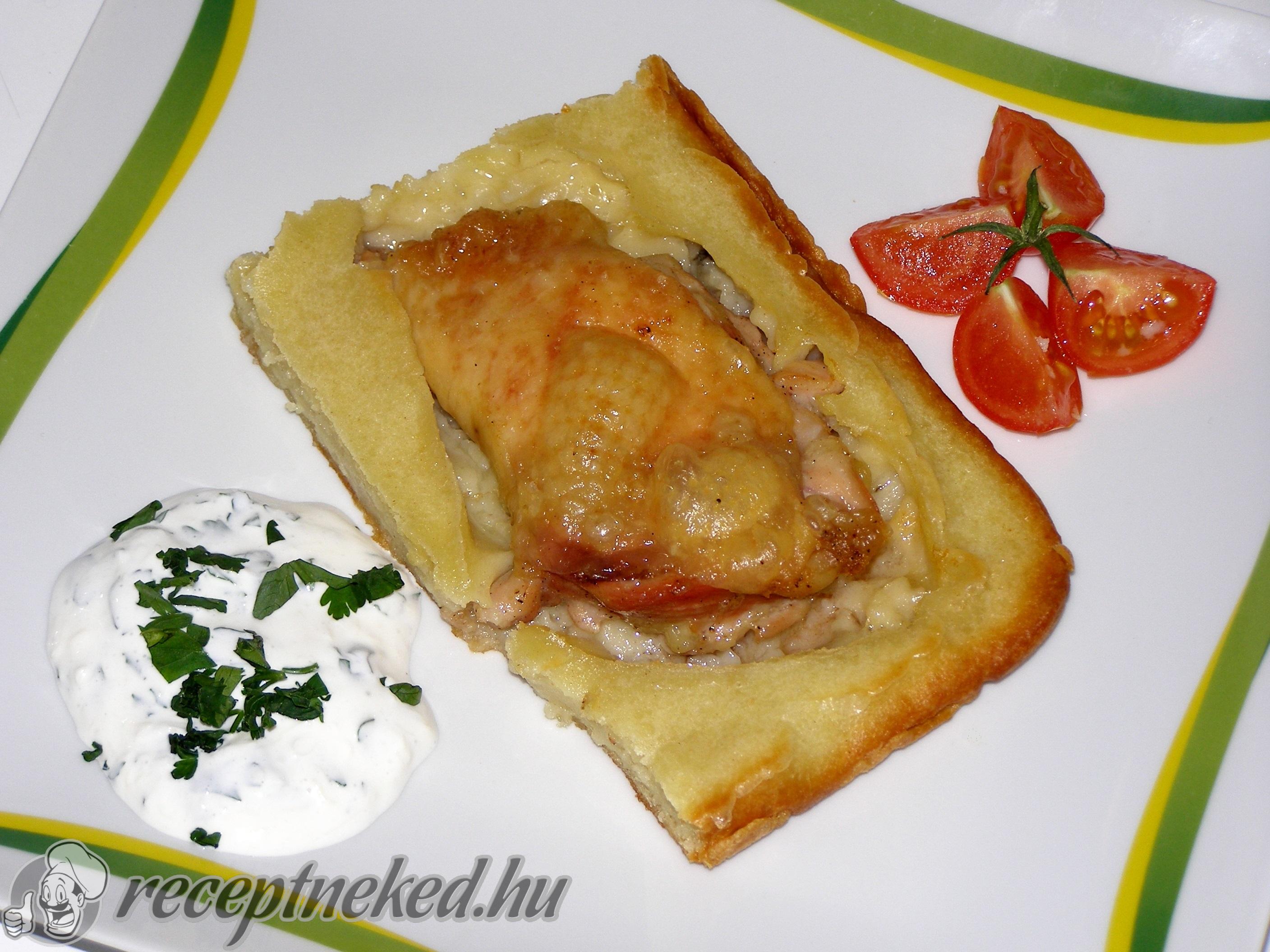 Gáztepsibe öntjük a fél deci olajat és 200 fokra előmelegített sütőben felforrósítjuk. Elterítjük benne a tésztát és bőrükkel felfelé kirakjuk a húsdarabokkal.