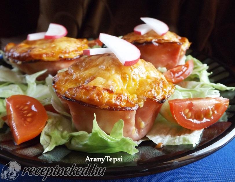 Az előkészített muffin sütő mélyedéseibe nyomkodjuk a sonkát. A csirkés masszát belekanalazzuk a kosárkákba.