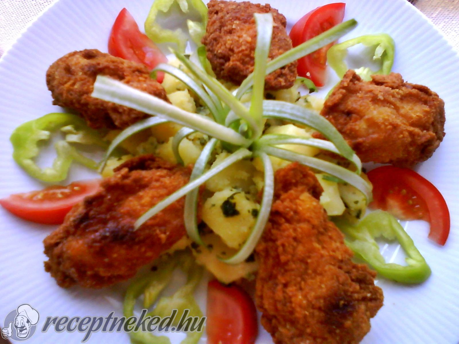 A fűszereket elkeverjük a liszttel, majd a szárnyakat először a fűszeres lisztbe, utána a felvert tojásba, végül a burgonyapehelybe forgatjuk. Bő olajban, közepes hőfokon aranybarnára sütjük.
