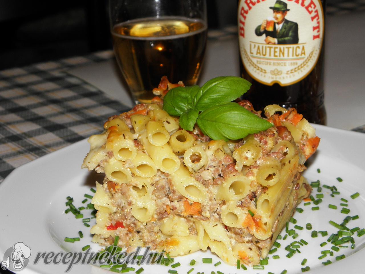 A tejfölt kikeverjük a félretett hússzafttal és ezzel meglocsoljuk az ételt. Megszórjuk reszelt sajttal és addig sütjük, míg a sajt szépen rápirul 200 fokon.