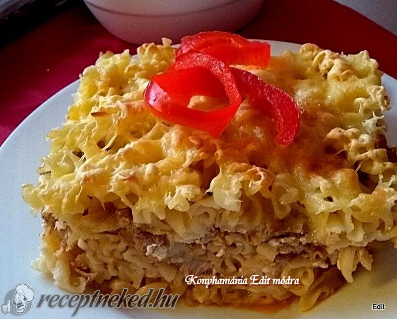 Olajjal kikent tepsibe tesszük a spagettit, rá a cukkini karikákat, majd a húst (tettem félre szaftjából a tejföl kikeveréséhez).