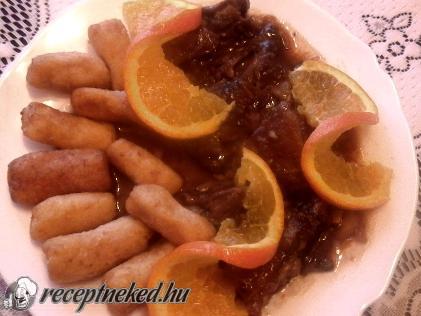 A kacsa bőrét a bontási lyuktól a nyakáig egy fakanál segítségével elválasztjuk a mellhústól úgy, hogy a tenyerünkkel is rásegítünk és az így kapott résen behelyezzük és gusztán elrendezzük a narancsszeleteket a bőre alatt.