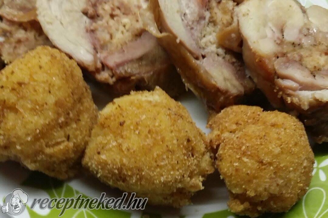 A szalonnát kipirítjuk, megdinszteljük rajta a hagymát. Levesszük a tűzről, majd hozzákeverjük a kinyomkodott zsemléket, a kockára vágott főtt tojást, a petrezselyemzöldet és 1 nyers tojást. A combokon fellazítjuk a bőrt, és betöltjük alá a tölteléket.