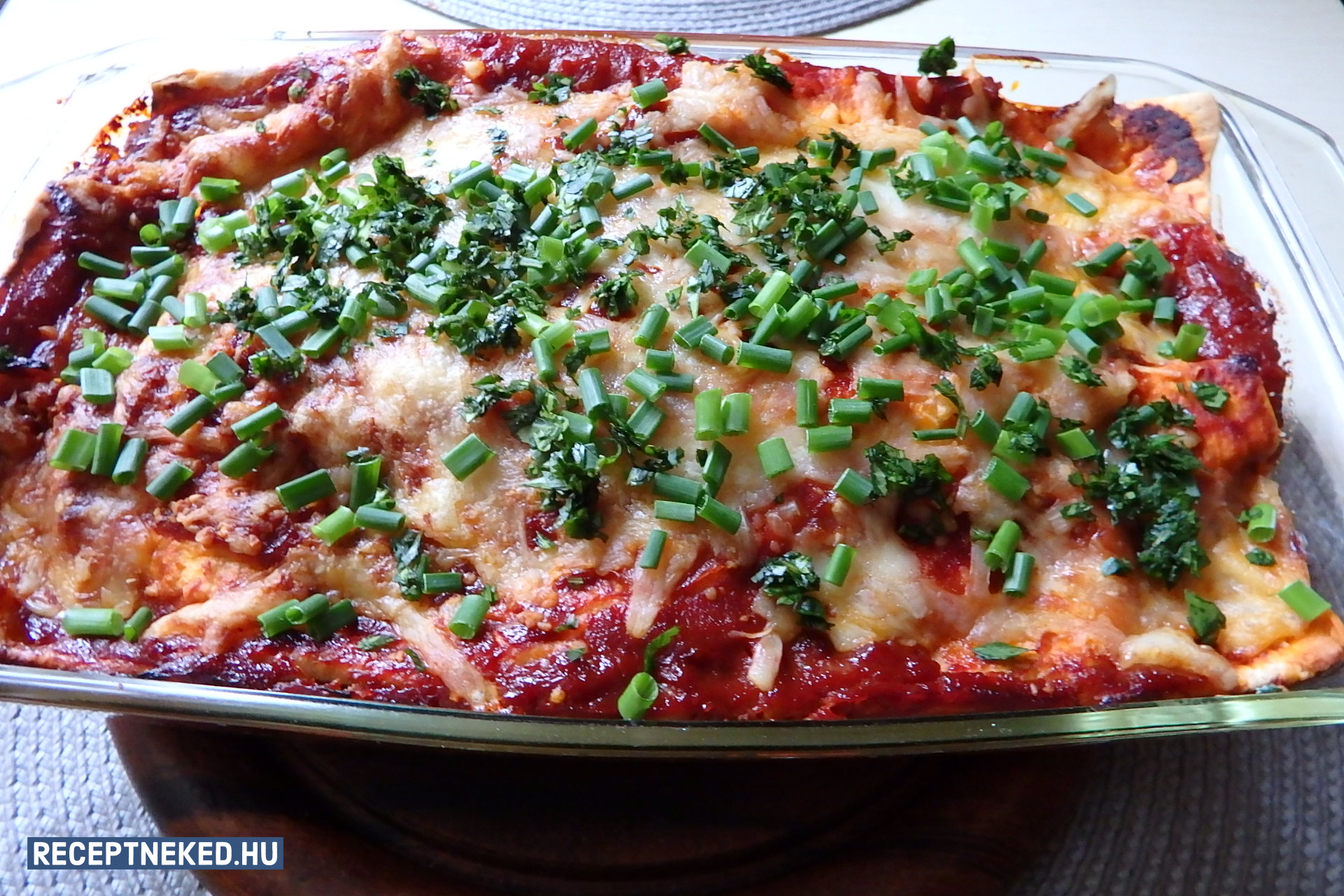 A sütőtál aljára öntjük a paradicsommártás felét és erre helyezzük a tekercseket. Tetejére öntjük a maradék mártást, majd vastagon megszórjuk a reszelt sajttal. 200 fokos sütőbe tolva készre sütjük 20 perc alatt.