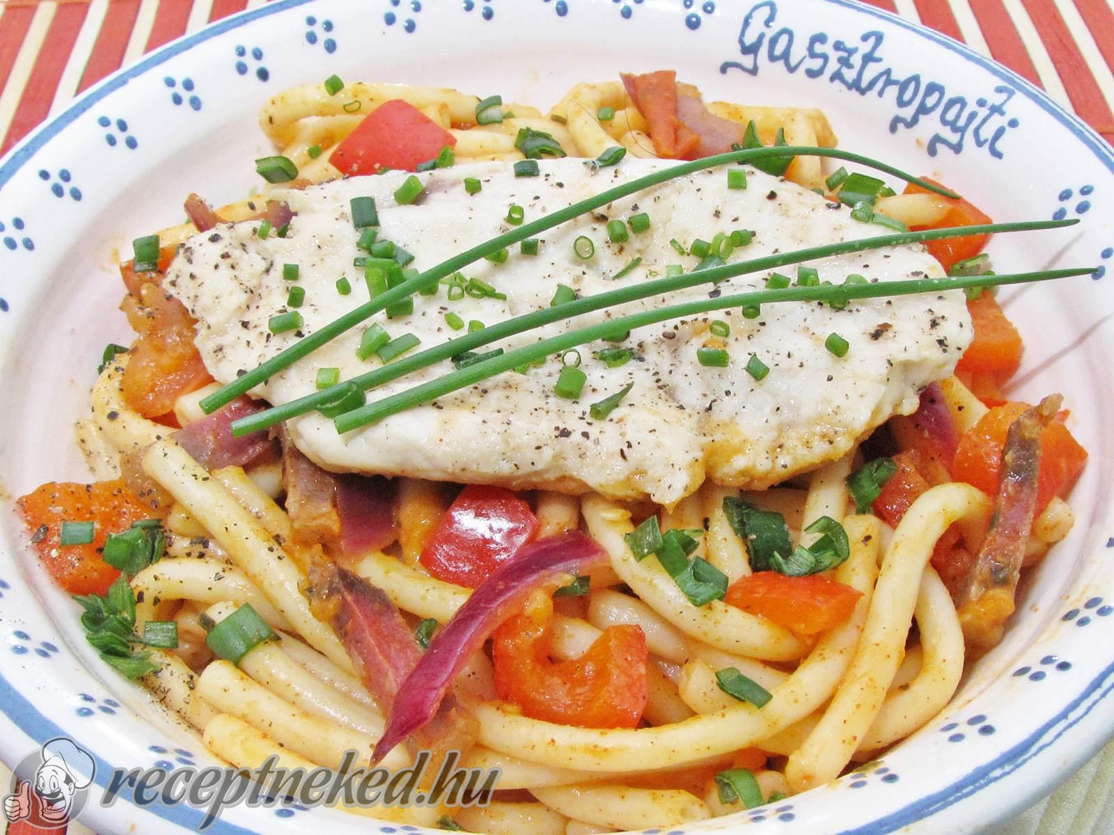 A fűszeres sült csirkemellet fel is csíkozhatjuk, de egészben is ráhelyezhetjük a mediterrán jellegű tésztára.