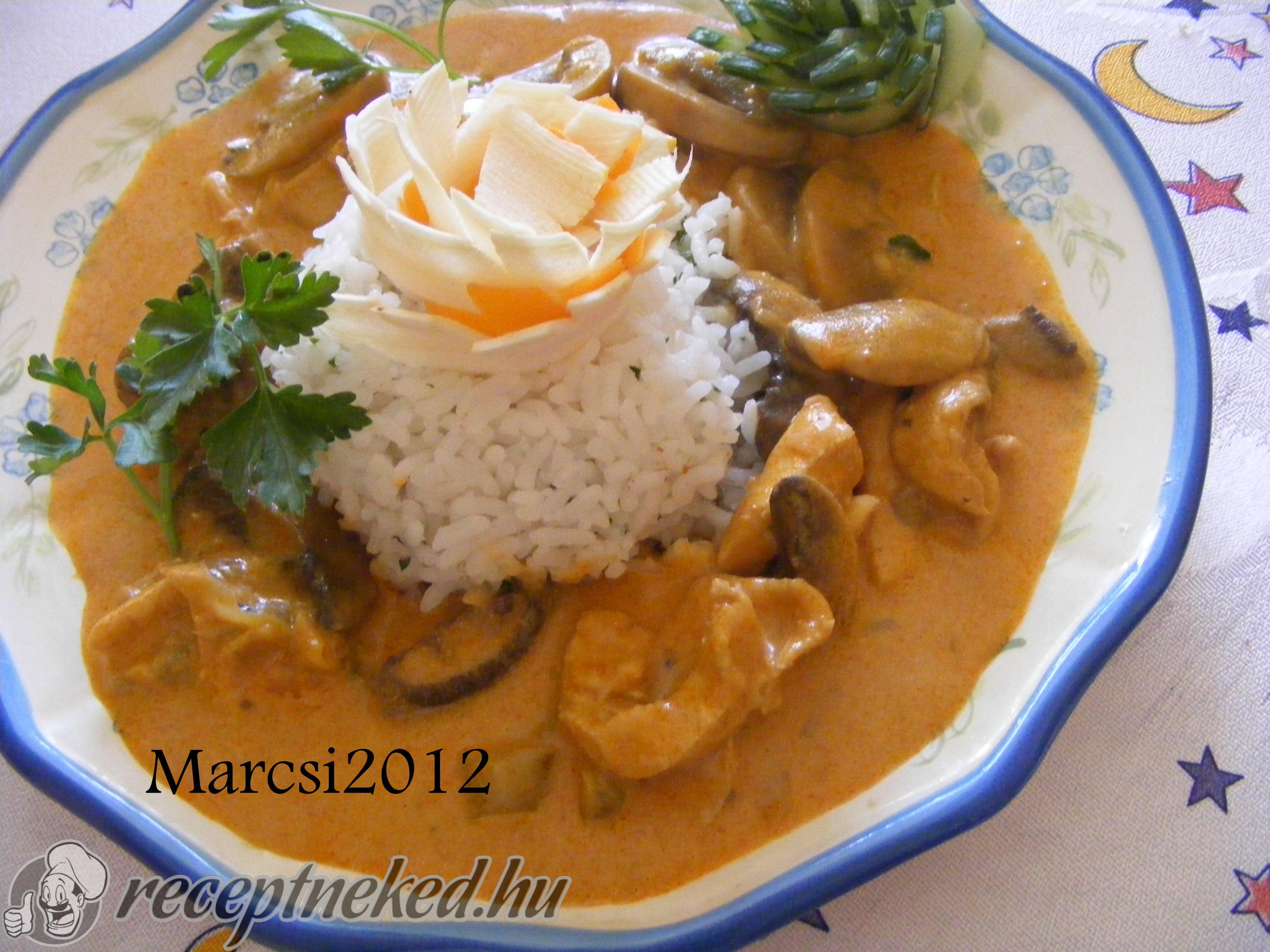 A gombát és a csirkemellet vékony csíkokra vágjuk. A hagymát kevés olajon üvegesre pároljuk, majd hozzáadunk egy kiskanál pirospaprikát, a csirkemellet és egy kevés vizet. Amikor a hús kezd puhulni, hozzáadjuk a gombát is, és addig főzzük, amíg a hús teljesen meg nem puhul.
