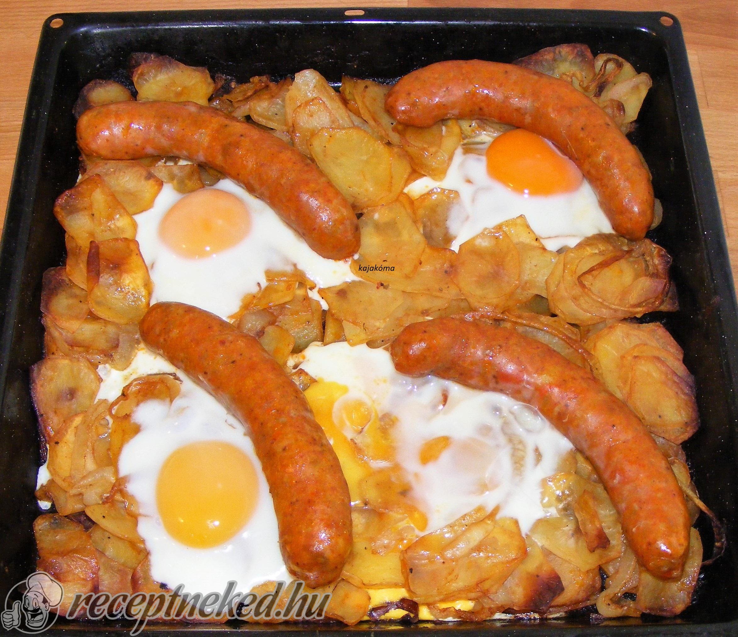 Egy tepsit vagy formát kiolajozunk, ebbe tesszük sorba a hozzávalókat. A tetejére szórjuk a fokhagymát (amit aprítunk).