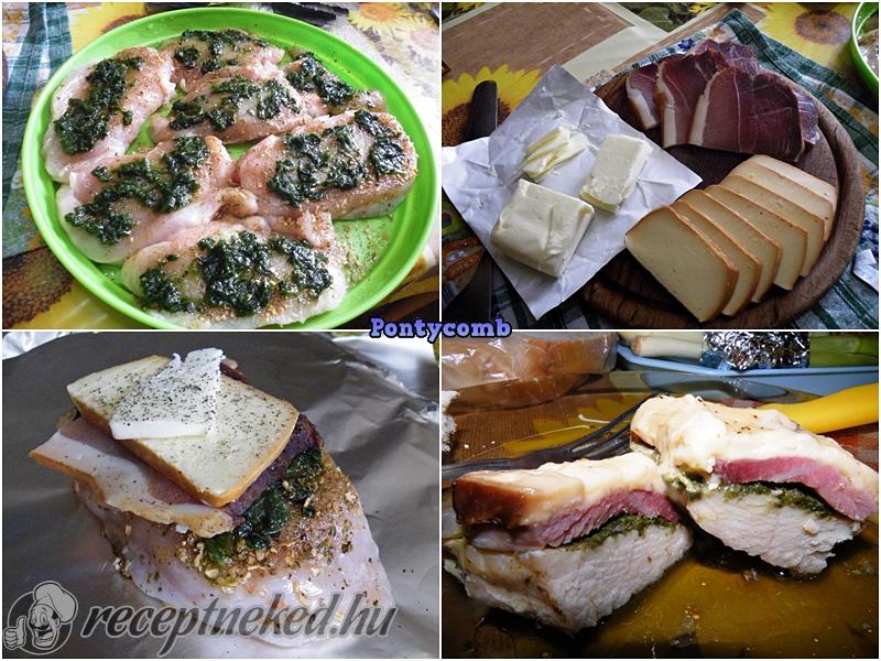 A közepére teszünk egy szelet vajat, ráfektetjük a csirkemellet, megszórjuk a fűszerkeverékkel, megkenjük medvehagyma pestoval vagy lilahagyma karikákat teszünk rá. Erre jön egy szelet füstölt sonka, majd egy szelet füstölt sajt, azután a másik szelet vaj, végül megborsozzuk és becsomagoljuk az alufóliába úgy, hogy a széleit feltekerjük ügyelve, hogy süléskor nehogy kifolyjon a finom fűszeres mártogatós sült vaj.