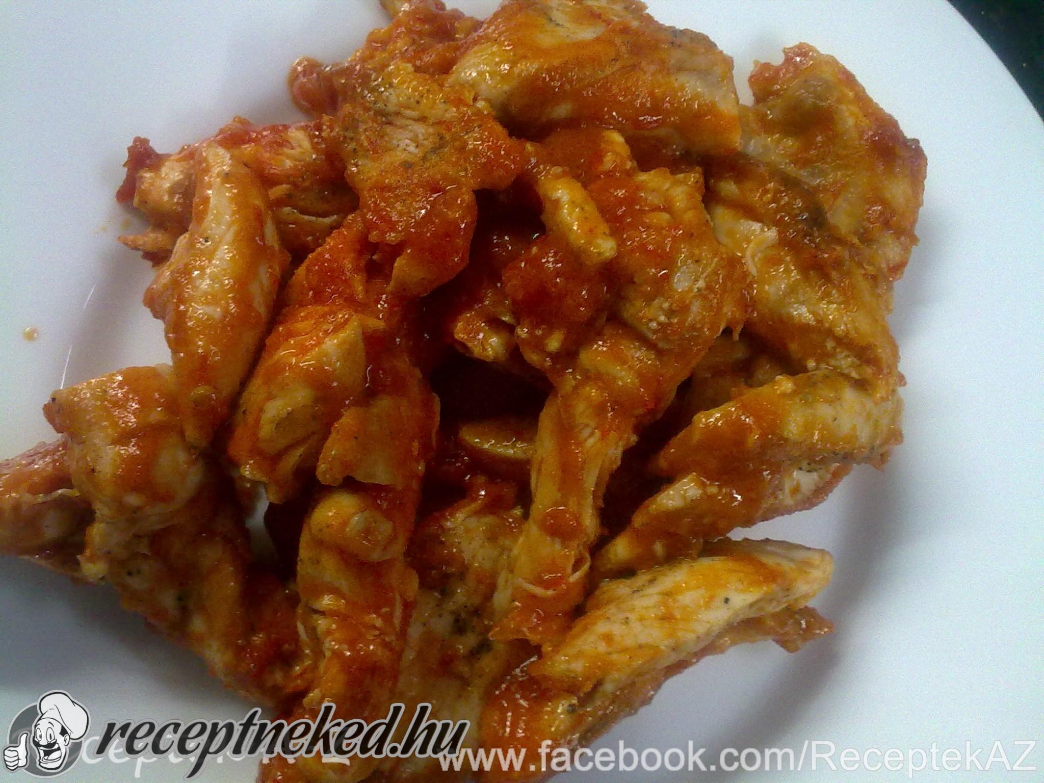 A csirkemellet kisujjnyi vékony csíkokra vágjuk, sózzuk, borsozzuk. Olívaolajon nagy lángon megpirítjuk a húst, majd hozzáadjuk az apróra vágott paradicsomot (vagy paradicsomszószt), zúzott fokhagymát, gyömbért és a füstölt szezámolajat.