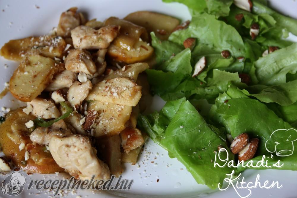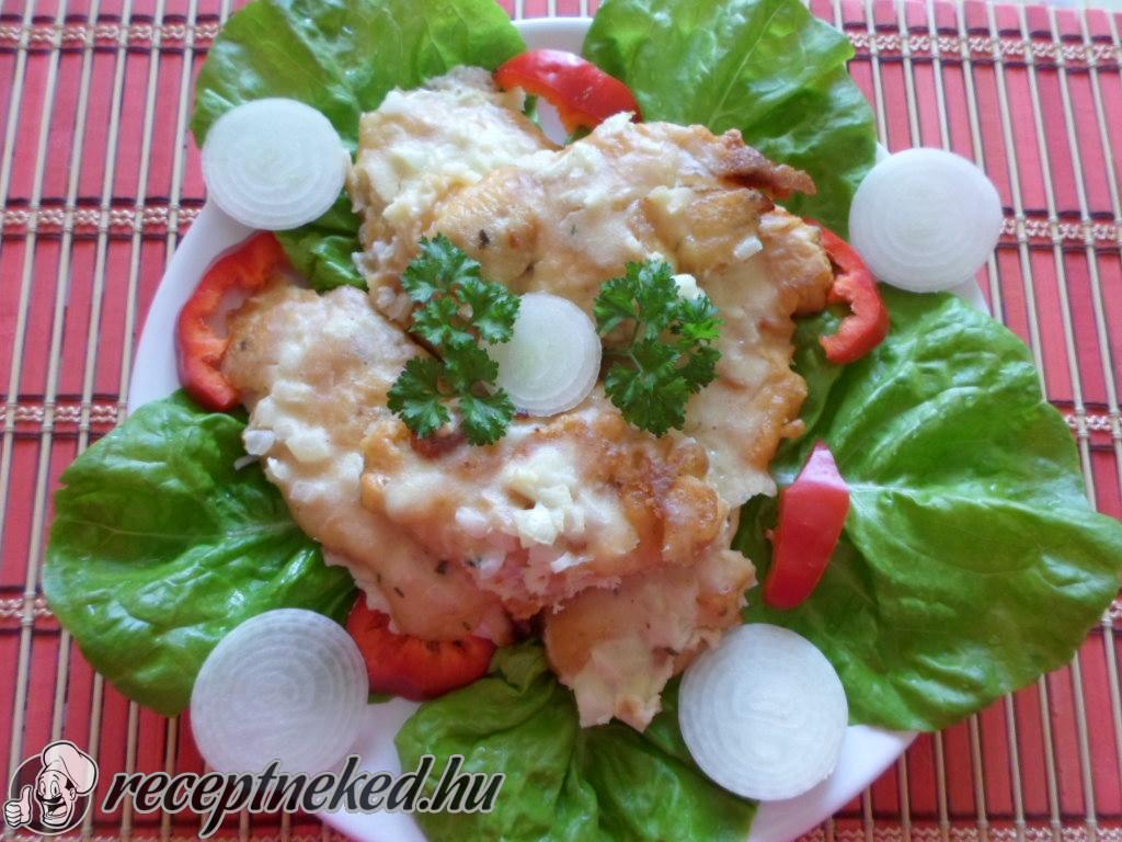 A kész hagymás csirkemellet kifőtt tésztával tálaljuk.