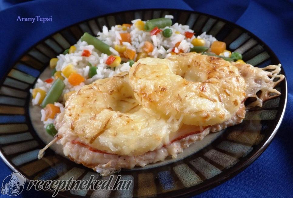 [box style=”info”]Nem készítek gyakran gyümölcsös húsokat, mert a család eddig nem igazán kedvelte. De most ez az ananászos szelet ízlett mindenkinek, mert nem volt túl édes, de mégis puha, szaftos, és jó sajtos. A gyerekek is szerették. Zöldséges rizs körettel kínáltam.[/box]