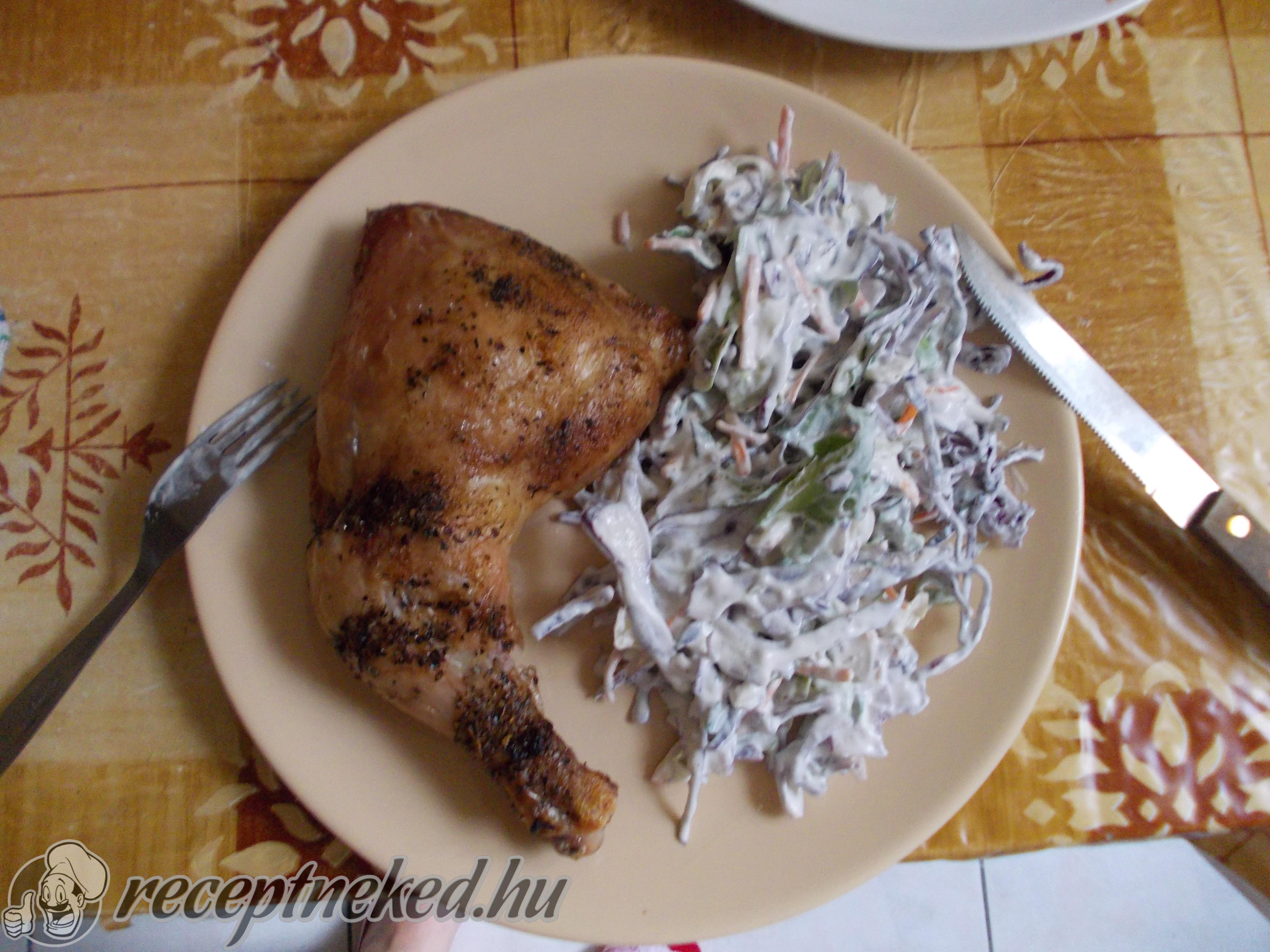 A fűszereket és a fokhagymát elkeverjük a joghurtban. Ebbe a pácba tesszük a combokat. Ezt előző nap is elkészíthetjük, így az ízek jobban érvényesülnek majd, de néhány órára mindenképpen tegyük hűtőbe.