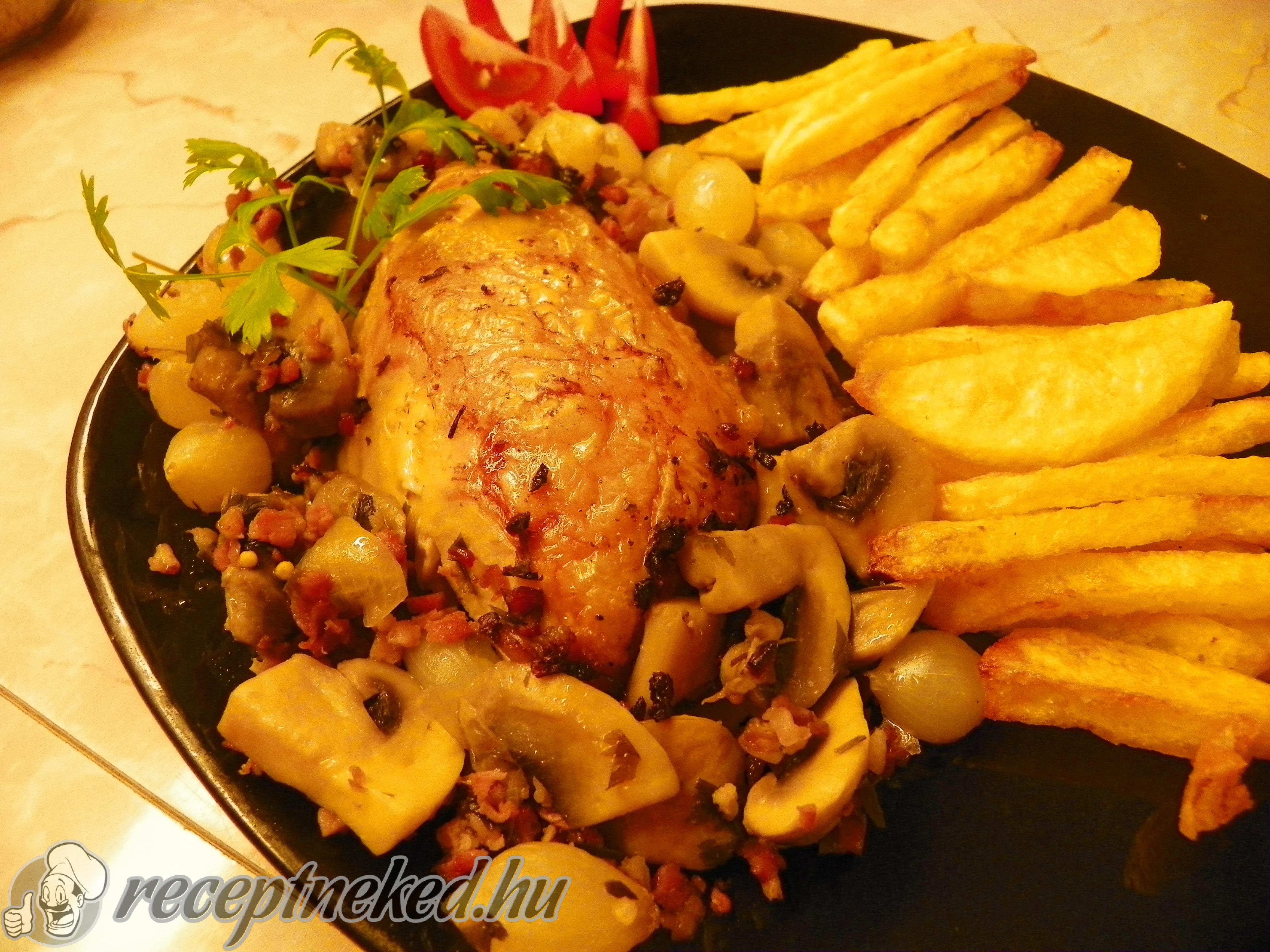 Eközben a szalonnát felkockázom, zsírjára sütöm. Hozzáadom a gyöngyhagymát és a gombát, együtt párolom néhány percig. Felöntöm borral, majd az egészet ráborítom a megsült csirkére. Még egy rövid ideig visszateszem a sütőbe.