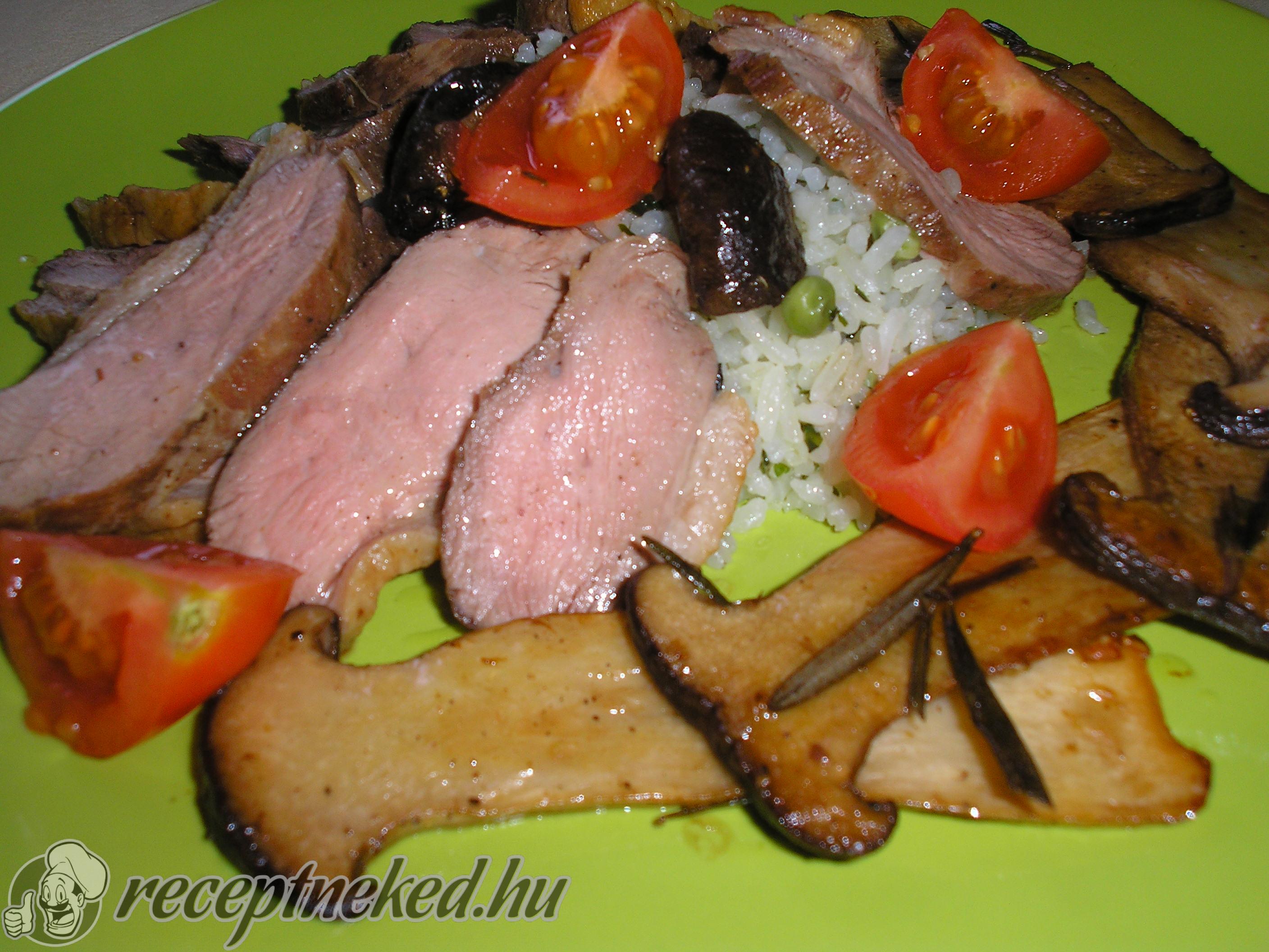Ezután betakarjuk alufóliával,és így sütjük médiumra.levesszük a tűzhelyről 10 perc után,és pihentetjük a húst.Szeleteljük pár perc után vékonyra, rizibizivel,és a gombával tálaljuk.Koktélparadicsommal diszítjük.