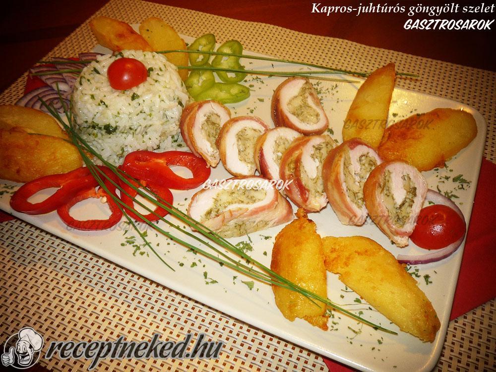 Elkészítjük a tölteléket: a hozzávalókat összekeverjük, a sózással vigyázzunk, mert a juhtúró elég sós. A pácolt csirkemelleket a kiterített baconszeletekre helyezzük, majd ráhalmozunk a töltelékből, feltekerjük. Olívaolajjal kikent jénaiba sorban lerakjuk. Letakarjuk alufóliával, 30 percet sütjük előmelegített sütőben, majd levesszük a fóliát, és szépen megpirítjuk.