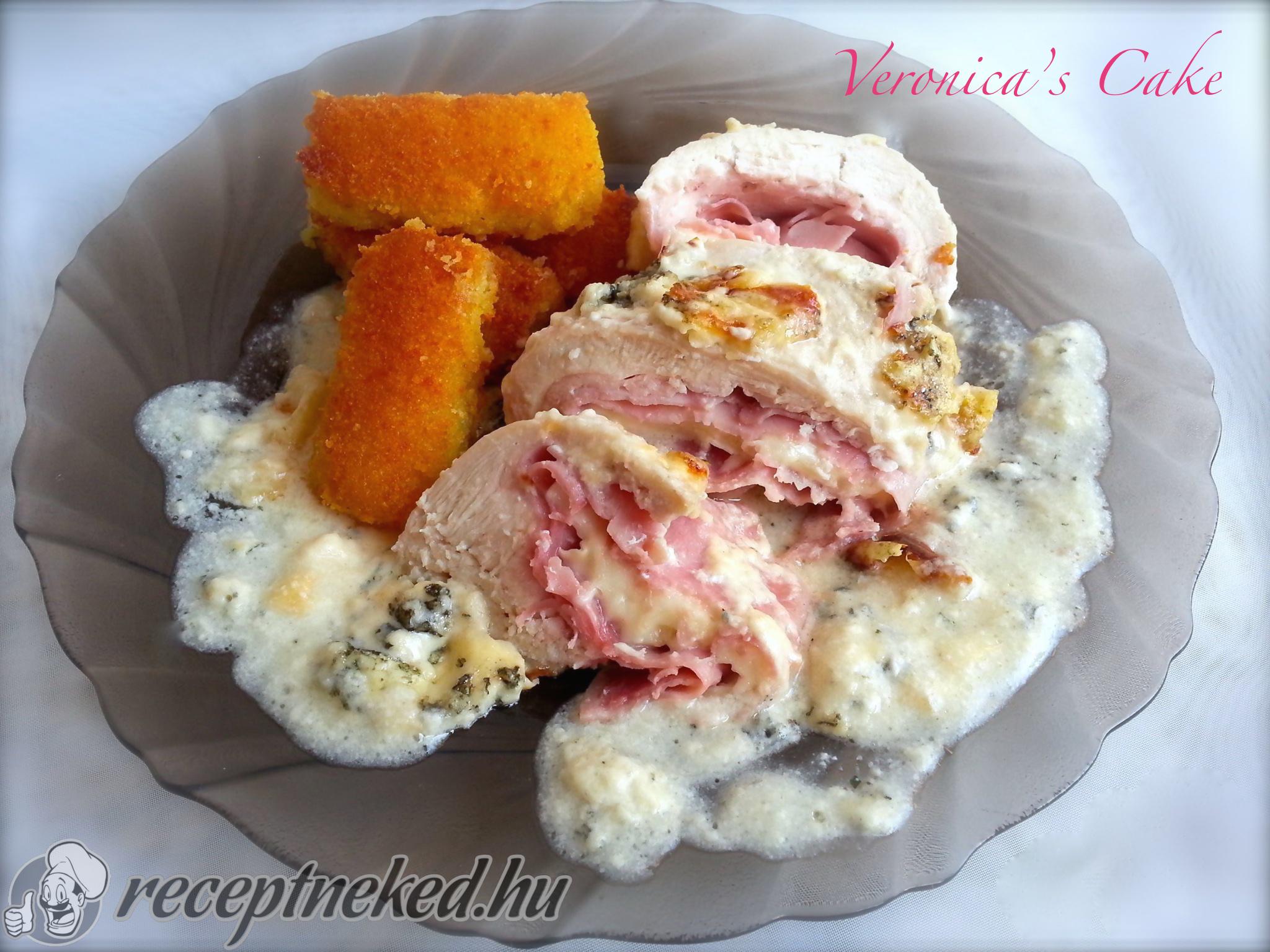 A csirkemellet kiklopfoljuk, és besózzuk. A hússzeletekre teszünk egy szelet sajtot, majd sonkát. Szorosan feltekerjük, és egy jénaiba, vagy tepsibe rakjuk. A többi hússal is hasonlóan járunk el. Szorosan egymás mellé rendezzük a roládokat.