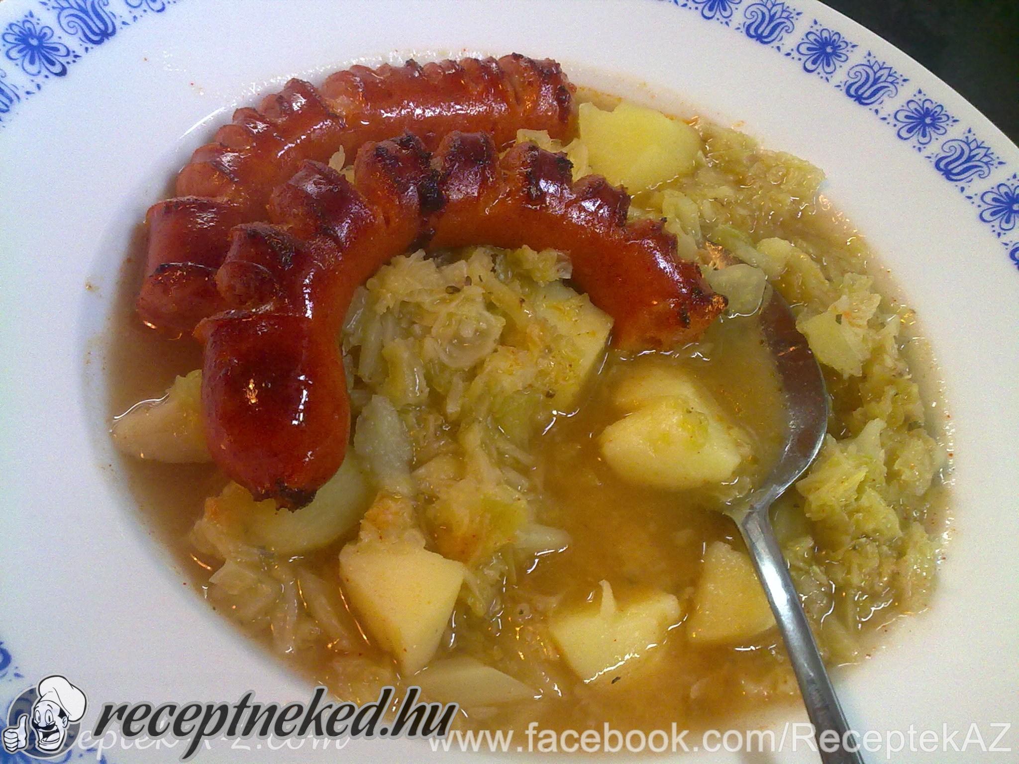 Közben megtisztítjuk a hagymákat és a burgonyát, majd kisebb kockára vágjuk. Hozzáadjuk a káposztához, majd fűszerezzük.