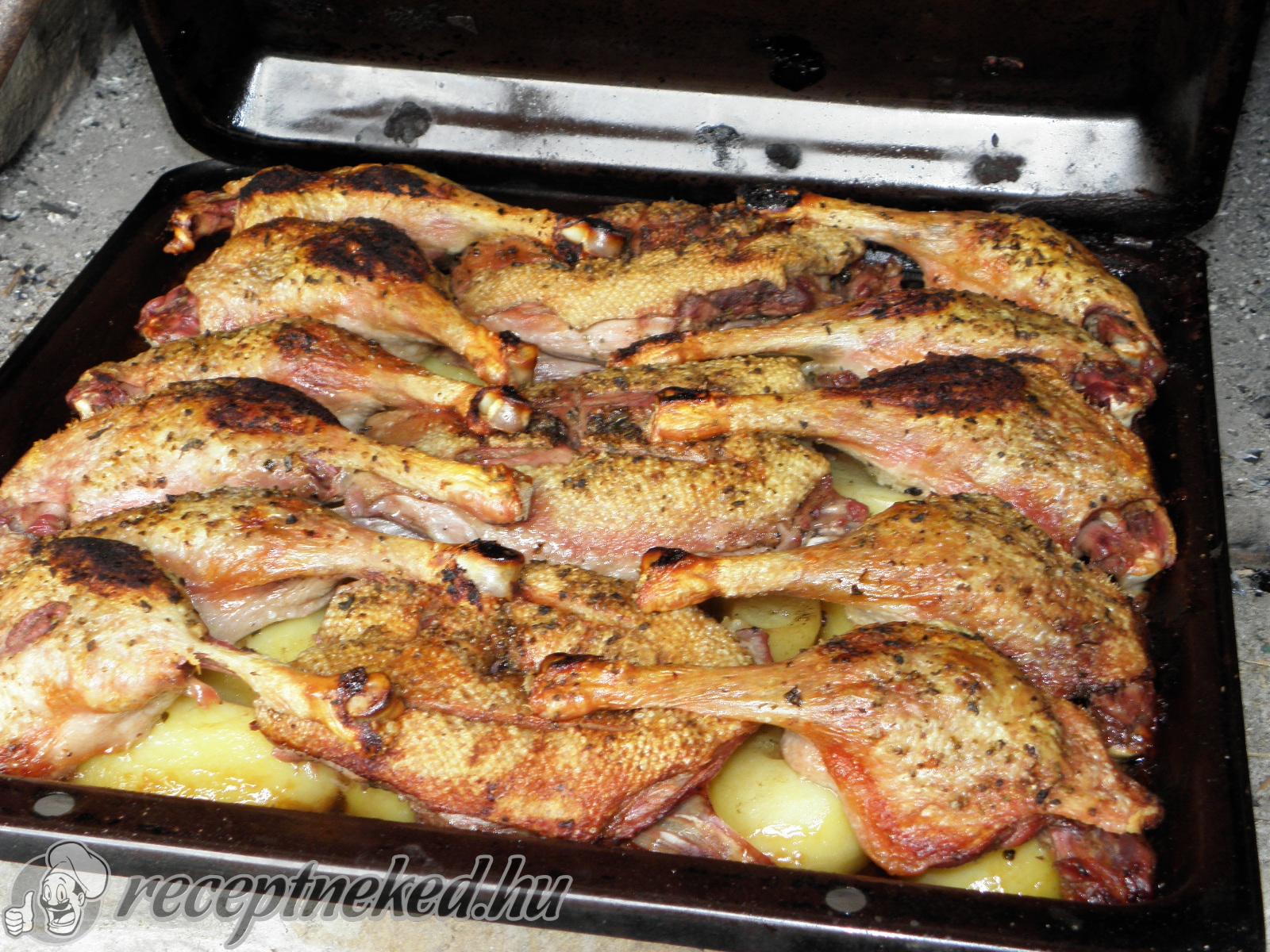 A húsokat a krumplira rakom, aláöntöm a bort, egy másik tepsivel, vagy alufóliával lefedve, 300 fokos kemencébe tolom.