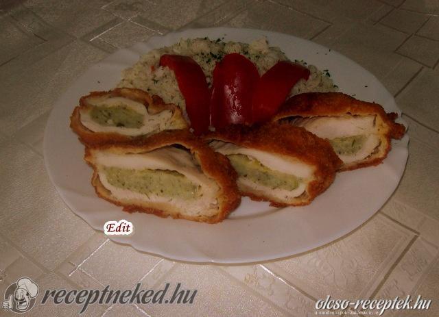 A bepanírozott csirkemelleket bő, forró olajban, közepes lángon, fedő alatt lassan sütjük, hogy a hús teljesen átsüljön és a töltelék belül megolvadjon. Amikor a panír aranyszínű és ropogós, a csirkemelleket papírtörlőre szedjük, hogy a felesleges olajat lecsepegtessük.