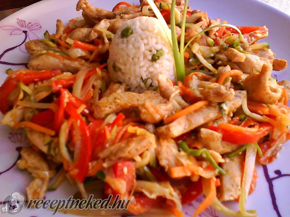 A paprikákat, a cukkini kockákat dobjuk rá a húsra és pár perc alatt pároljuk össze, közben a reszelt gyömbérrel, ketchuppal, borecettel ízesítsük, legvégül adjuk hozzá az ananászkockákat is.