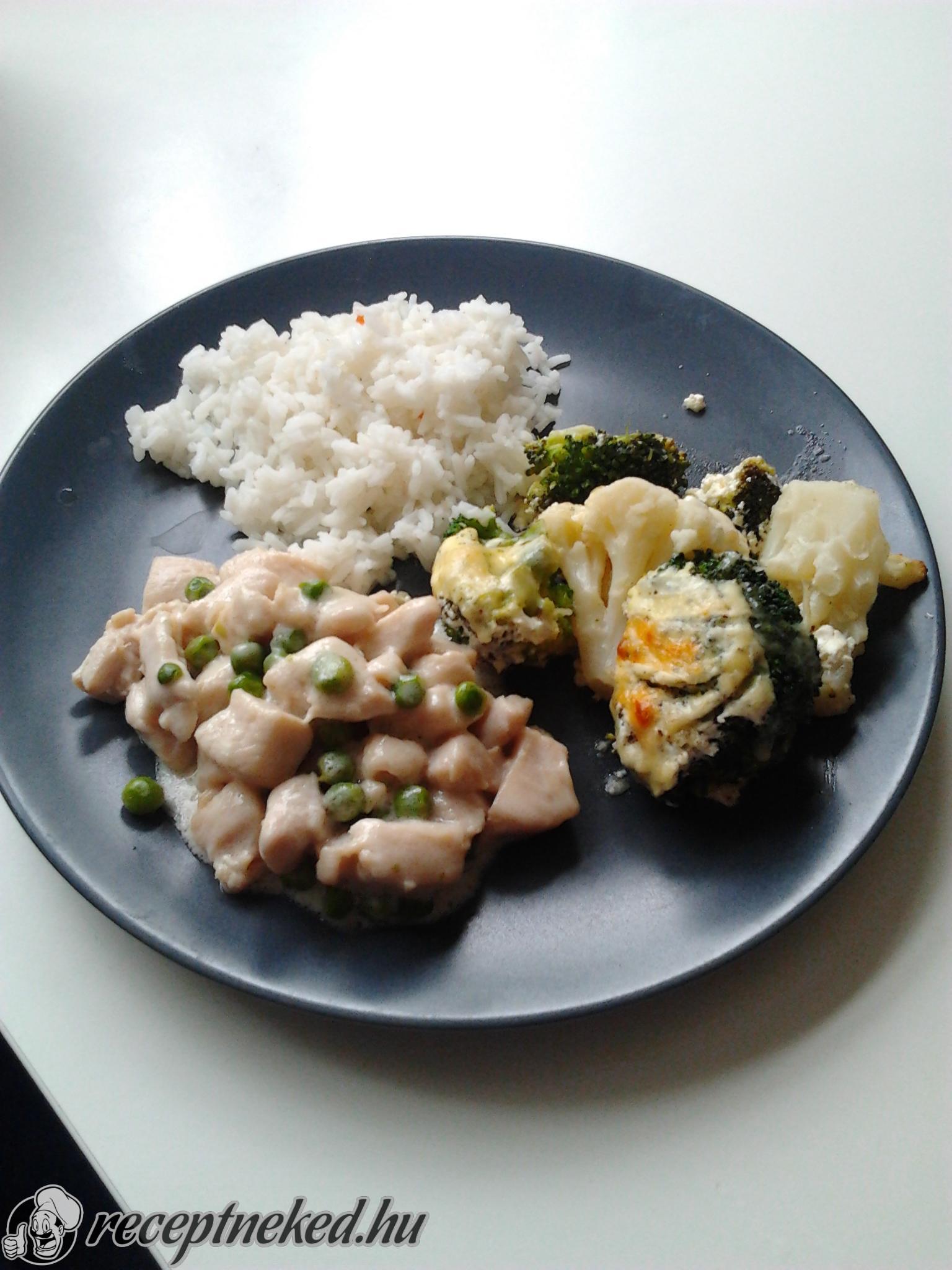 A csirkemellet felkockázom, és kevés olajon megpirítom a borsóval együtt. Sóval, borssal fűszerezem.