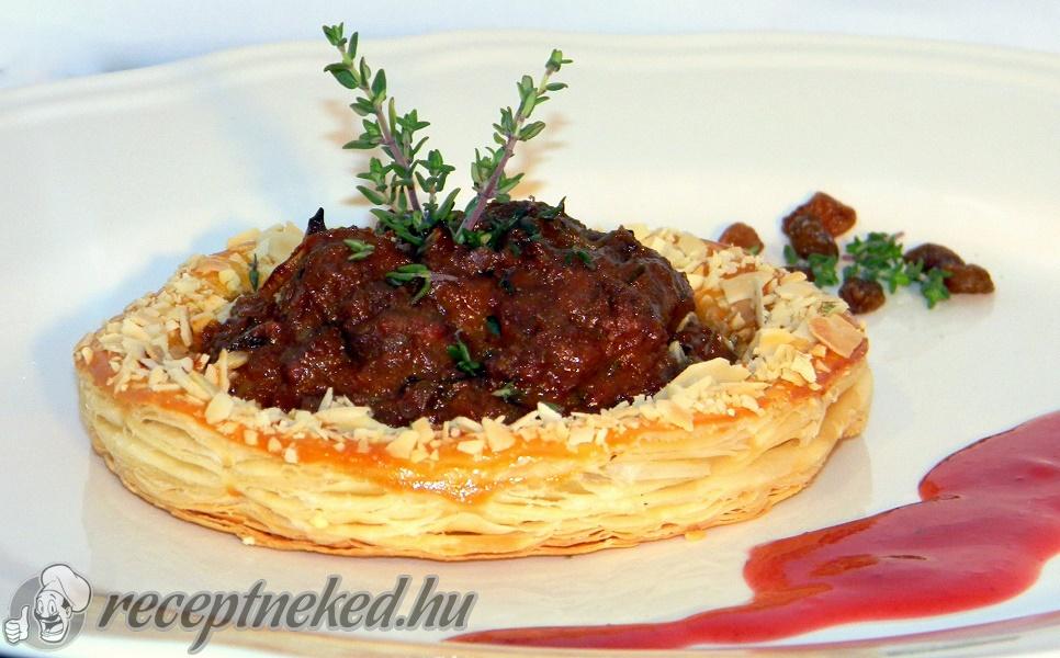 A leveles tésztát lisztezett munkalapon, fél cm vastagra nyújtjuk, és egy müzlis tálka segítségével 4 egyforma, kerek formára vágjuk. Mindegyik közepébe elosztjuk a kacsamájas ragut úgy, hogy a széleken körbe 1 cm-es peremet hagyunk, és ezt a ragu szélén éles késsel körbe vágjuk, úgy, hogy a kés pengéje csak félig vágja be a tésztát. Ezt a peremet tojássárgájával körbe lekenjük, és megszórjuk durvára aprított mandulával.