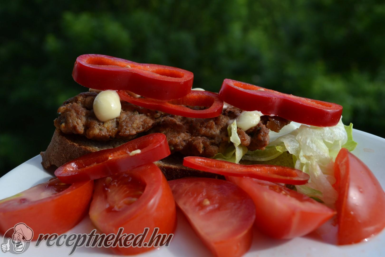 A húspogácsákat lekenjük ketchuppal, teszünk rá 1-1 karika szeletelt hagymát, ezt lekenjük tejföllel, rá 1-1 szelet paradicsomot teszünk, megszórjuk reszelt sajttal és készre sütjük 200 fokon.