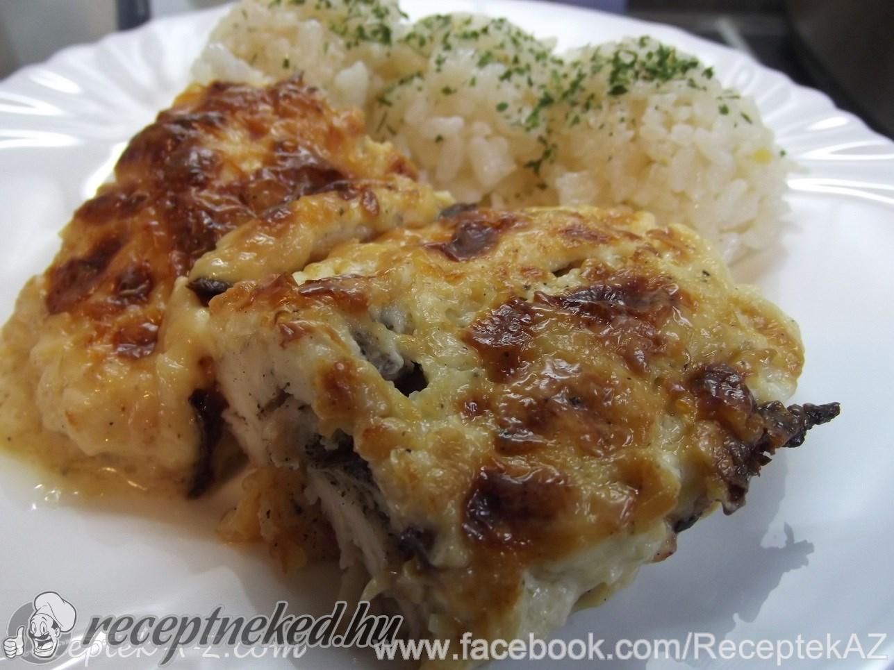 A vastagabb csirkemellet hosszában kettévágjuk, megízesítjük sóval és őrölt borssal, majd a felvert tojásba mártjuk. Egy jénai tálat kikenünk a krémsajt felével. Erre szórjuk a reszelt sajt felét. Szorosan egymás mellé fektetjük a tojásos csirkemell szeleteket és meghintjük a maradék reszelt sajttal. A reszelt sajtot egy kicsit rányomogatjuk a húsra. A maradék krémsajtot összekeverjük a főzőtejszínnel, sóval, borssal ízesítjük, majd ráöntjük a sajtos húsra. Előmelegített sütőben 180 fokon kb. 60 percet sütjük. Párolt rizzsel, főtt burgonyával, sült krumplival tálaljuk.