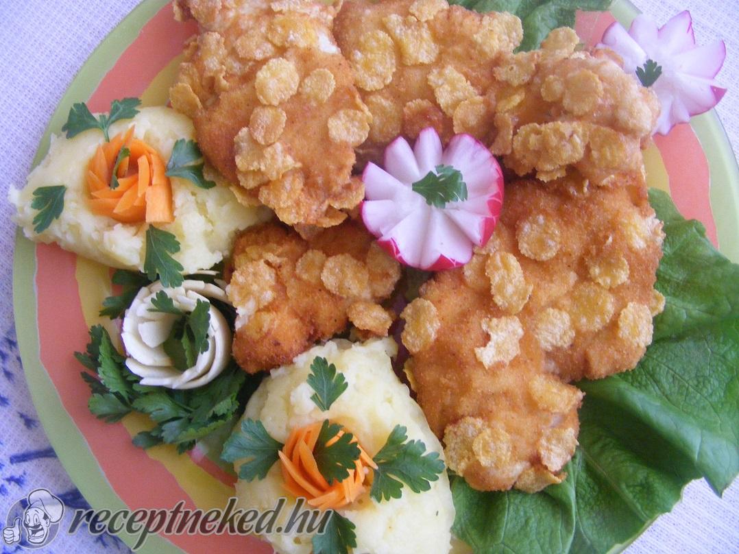 Egy tálban felverjük a tojásokat, egy másik tálba lisztet teszünk, a harmadikba pedig összekeverjük a durvára tört kukoricapelyhet és a zsemlemorzsát 2:1 arányban (pl. 2 rész kukoricapehely, 1 rész zsemlemorzsa).