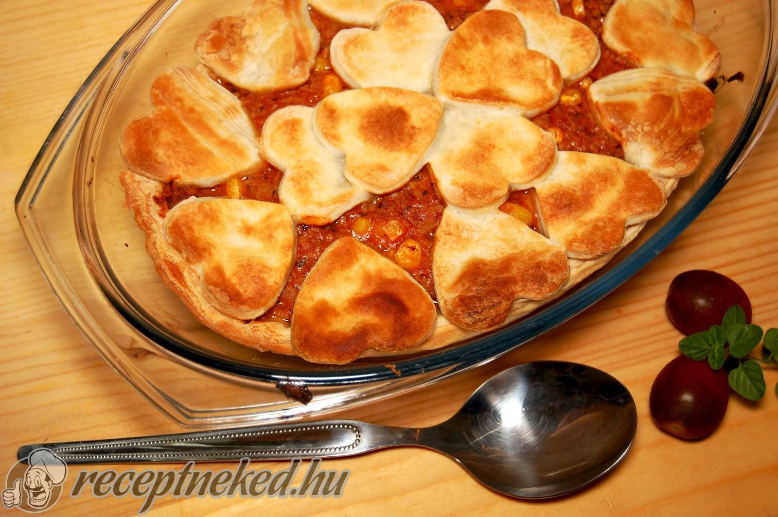 A maradék tésztából szíveket vágunk vagy bármilyen egyéb formát és rátesszük a hús tetejére ízlésesen elhelyezve. Mehet a sütőbe 200 fokon 25-30 percig sülni, míg a tészta szépen meg nem pirul és ropogós nem lesz.