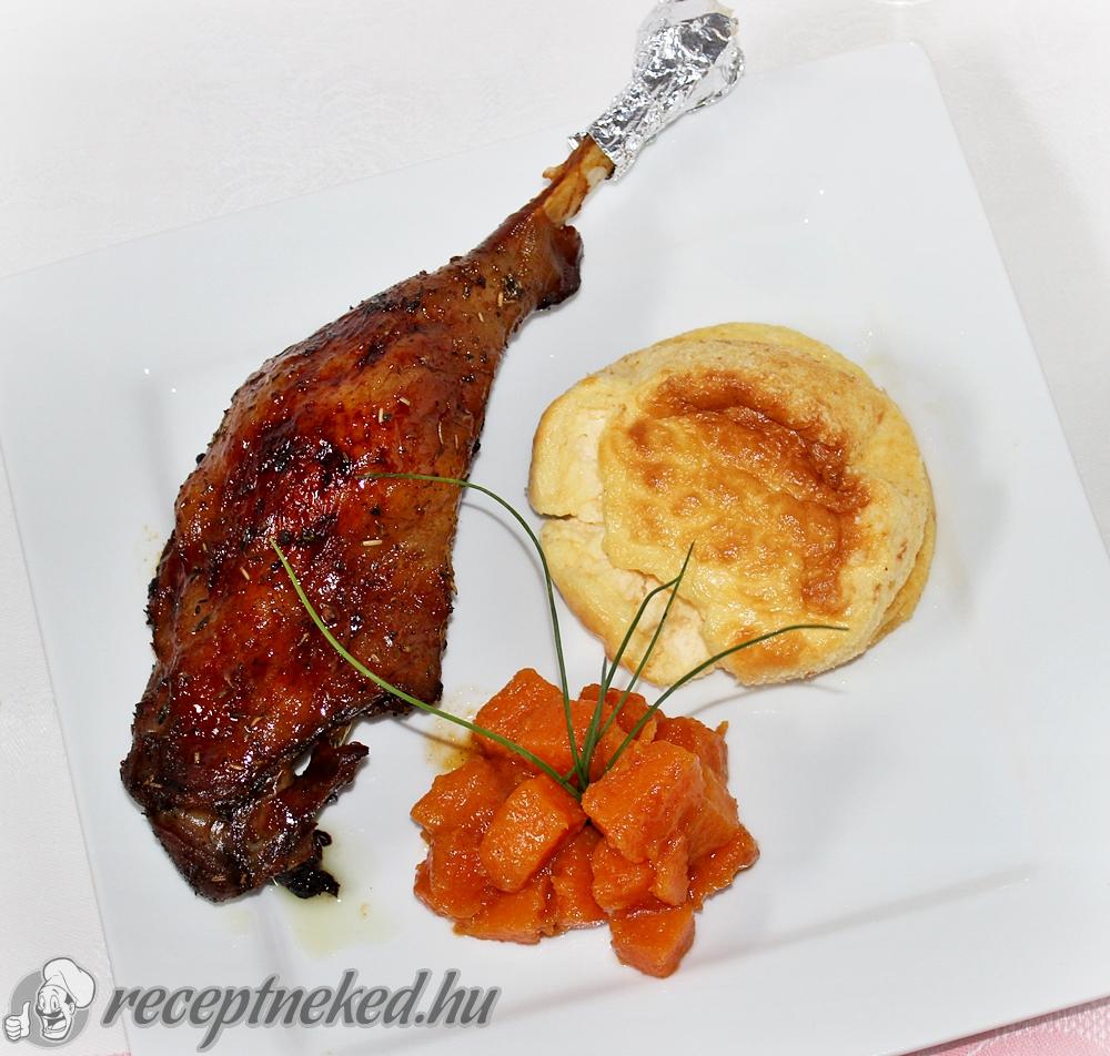 Helyezzük be előmelegített sütőbe, majd közepes hőmérsékleten pároljuk puhára a húst. Amikor már kellően megpárolódott vegyük le a fóliát, kenjük le a combokat mézzel, majd helyezzük vissza a sütőbe. Vegyük a hőfokot magasabbra, majd süssük szép pirosra, ropogósra.