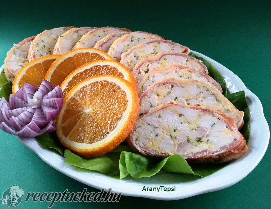 [box style=”info”]Ez egy olyan csirkés fogás, amit gyakran készítek nagyobb ünnepek, illetve családi összejövetelek alkalmával. Nagyon kedvelem, mert előre megsüthető, hidegen szépen szeletelhető és dekoratív hidegtál is kialakítható belőle.