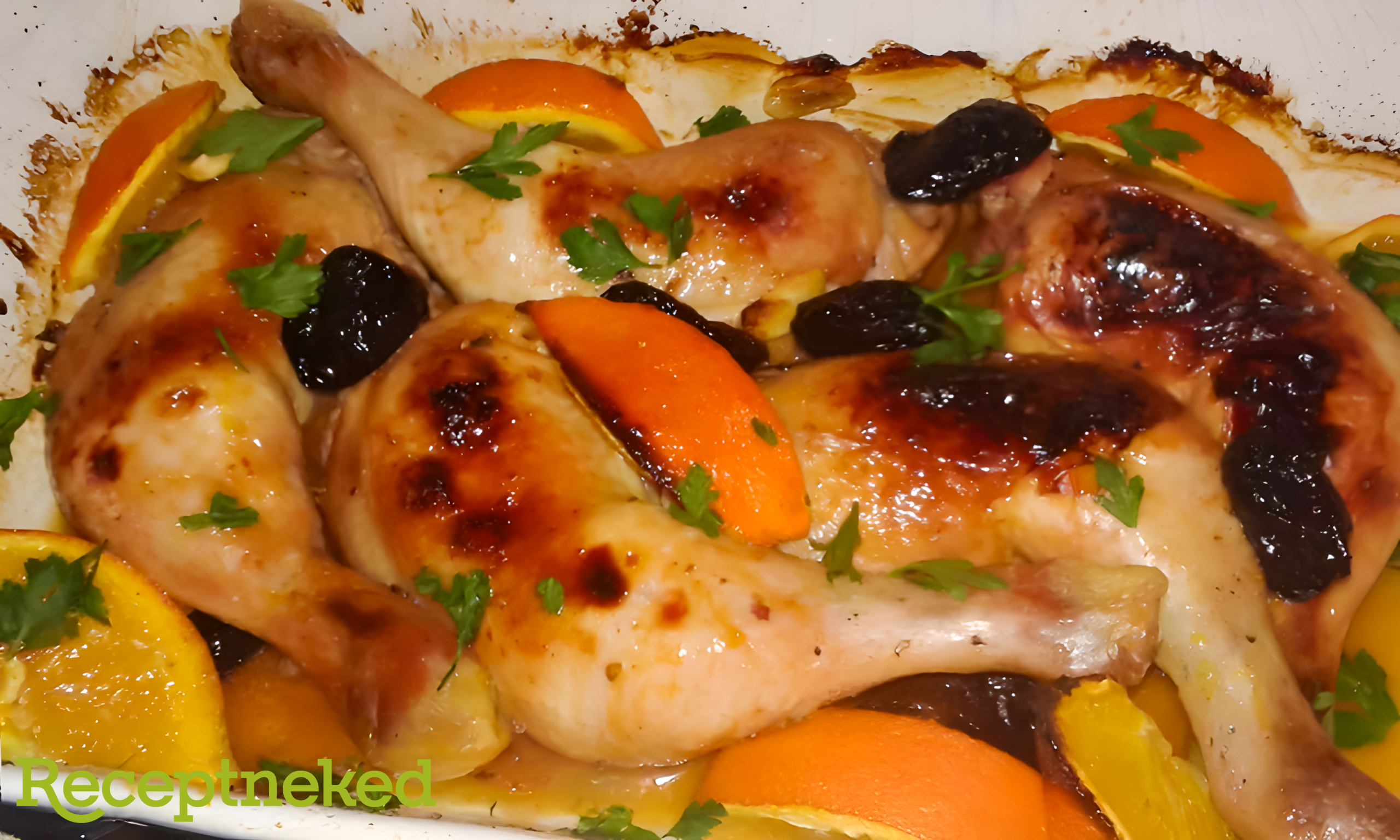 Ezután előmelegített, 180 °C-os sütőben letakarva kb fél óráig pároljuk, ezután levesszük a fóliát és egy ecsettel átkenjük a combokat a mézes narancslével, mellétesszük a narancsgerezdeket és az aszalt szilvát.