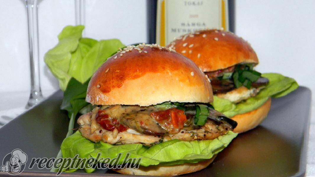 Az összeállításnál a bucikat kettévágom, mindegyikbe egy-egy alaposan megmosott és leszárított fejes saláta levelet ültetek, ráteszem a csirkemell szeletet, majd erre halmozom a gombás szószt, a tetejére friss medvehagyma csíkokat szórok, és az egészet betakarom a buci tetejével.