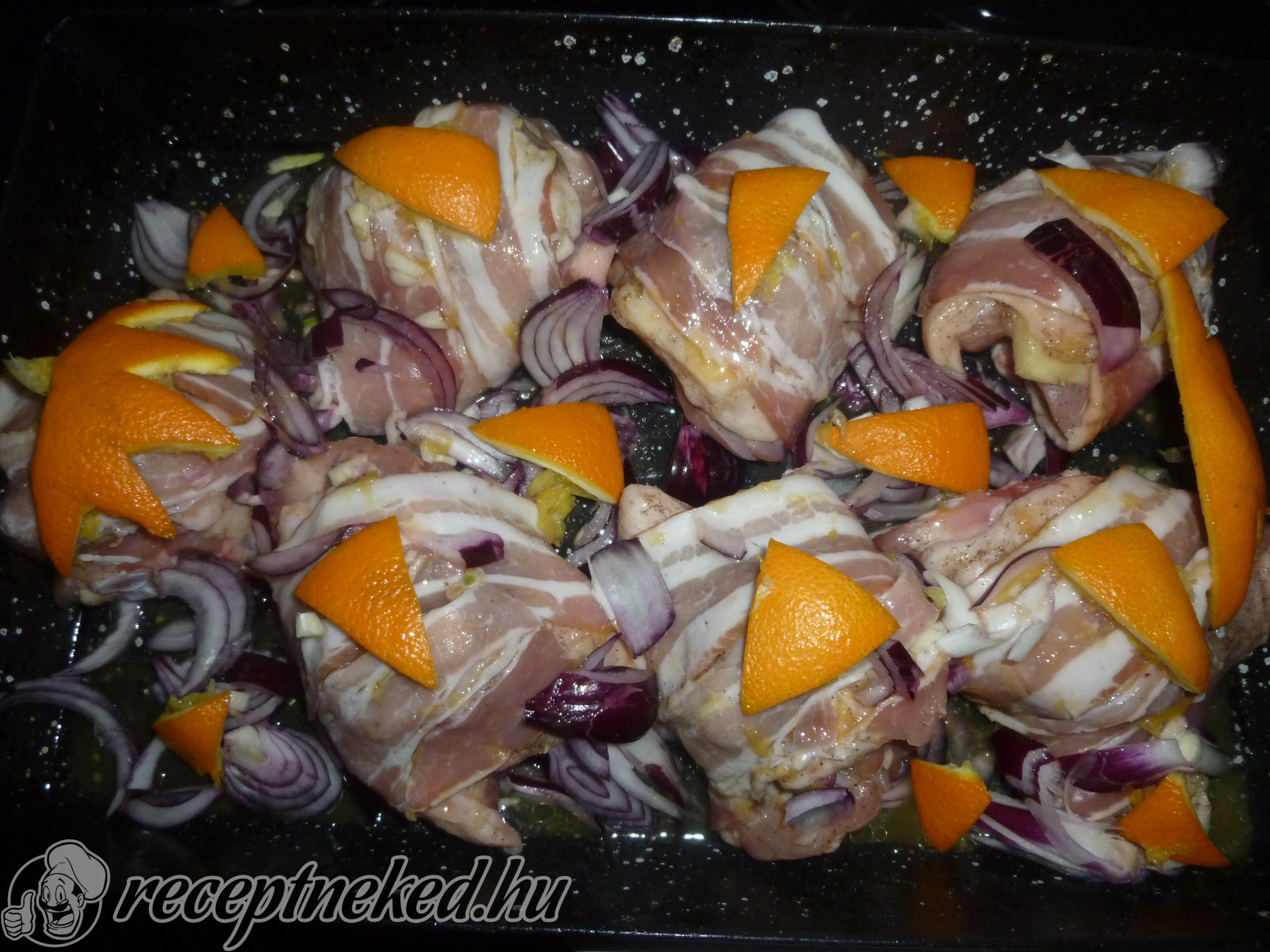 A lilahagymát és a fokhagymát apróra vágjuk, összekeverjük, majd félretesszük. Az egyik narancsot gerezdekre szedjük, az almát meghámozzuk, és gerezdeket vágunk belőle. A csirkecombokat előkészítjük, a bőrük alá egy-egy narancs- és almaszeletet helyezünk, majd sózzuk, borsozzuk. Ezután a combokat baconbe csomagoljuk, és tepsibe tesszük.