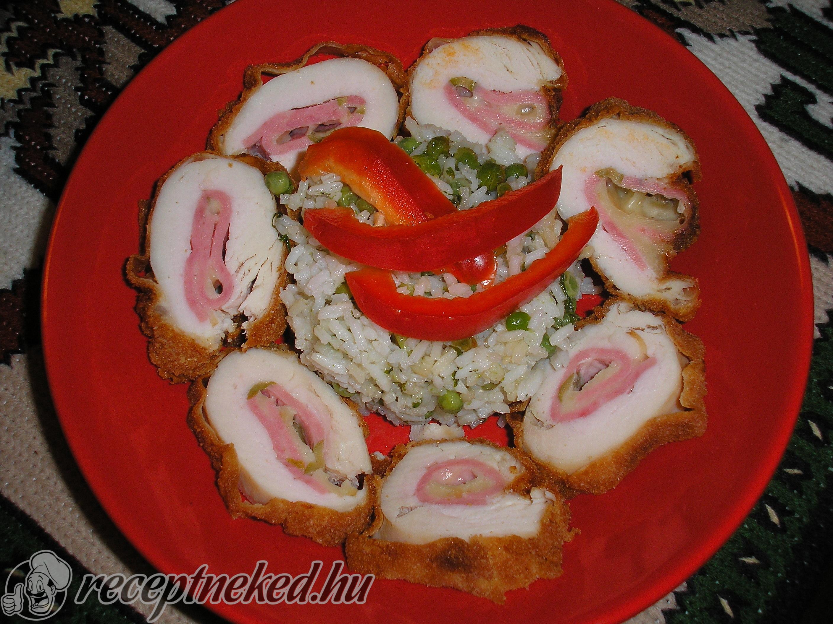 Tojásba, lisztbe, majd morzsába forgatjuk, és nem túl forró olajban szép lassan aranybarnára sütjük. Ha mindegyikkel elkészültünk, még forrón kivesszük a fa fogpiszkálót, és ferde szeletekre vágjuk a töltött mellszeleteket.