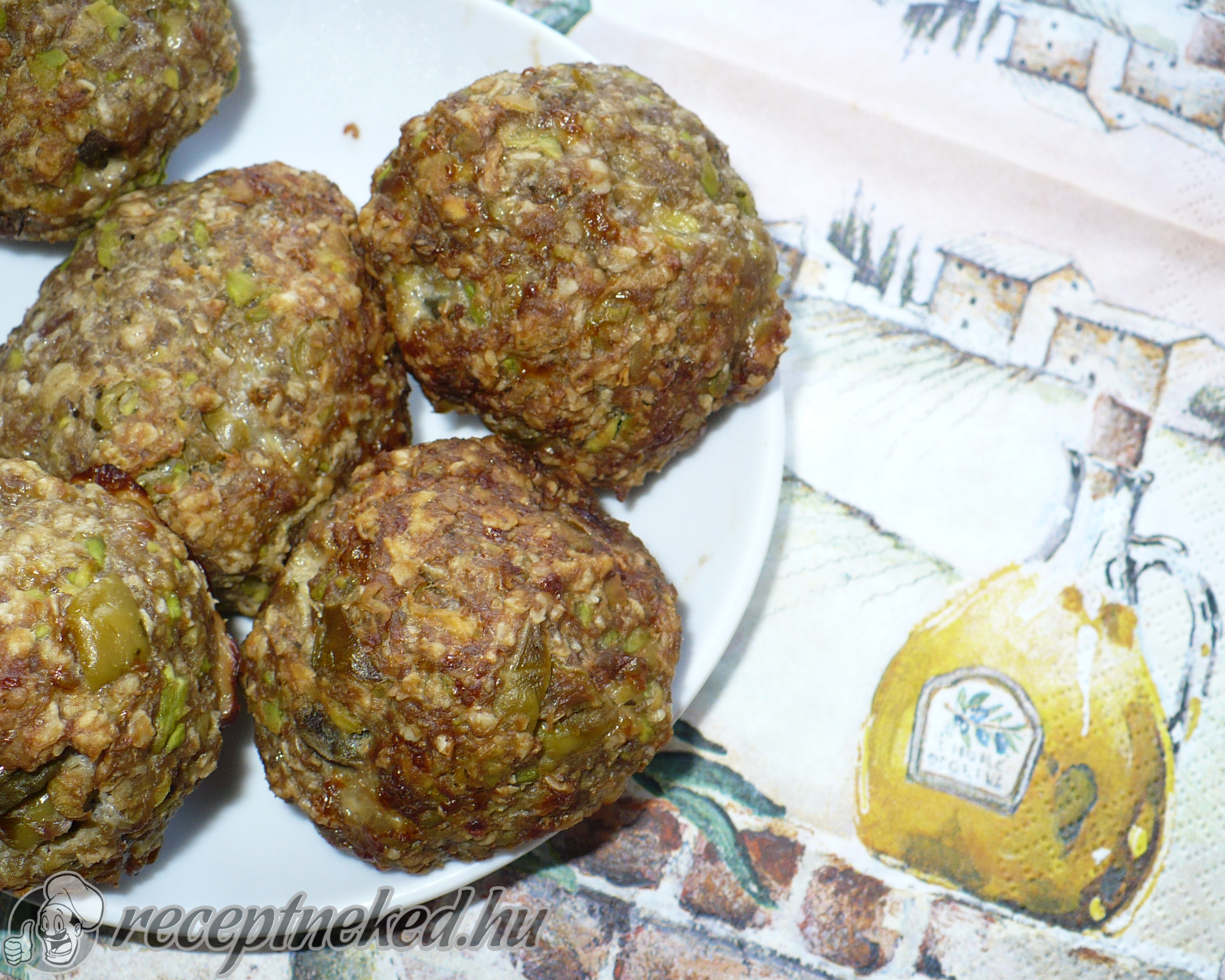 Hozzáadjuk az apró kockára vágott olívagyókat. Ezután, a zabpehely kivételével, az összes többi alapanyagot is beletesszük. Az egészet jó alaposan összegyúrjuk. Hozzáteszünk annyi zabpelyhet, hogy formázható legyen.