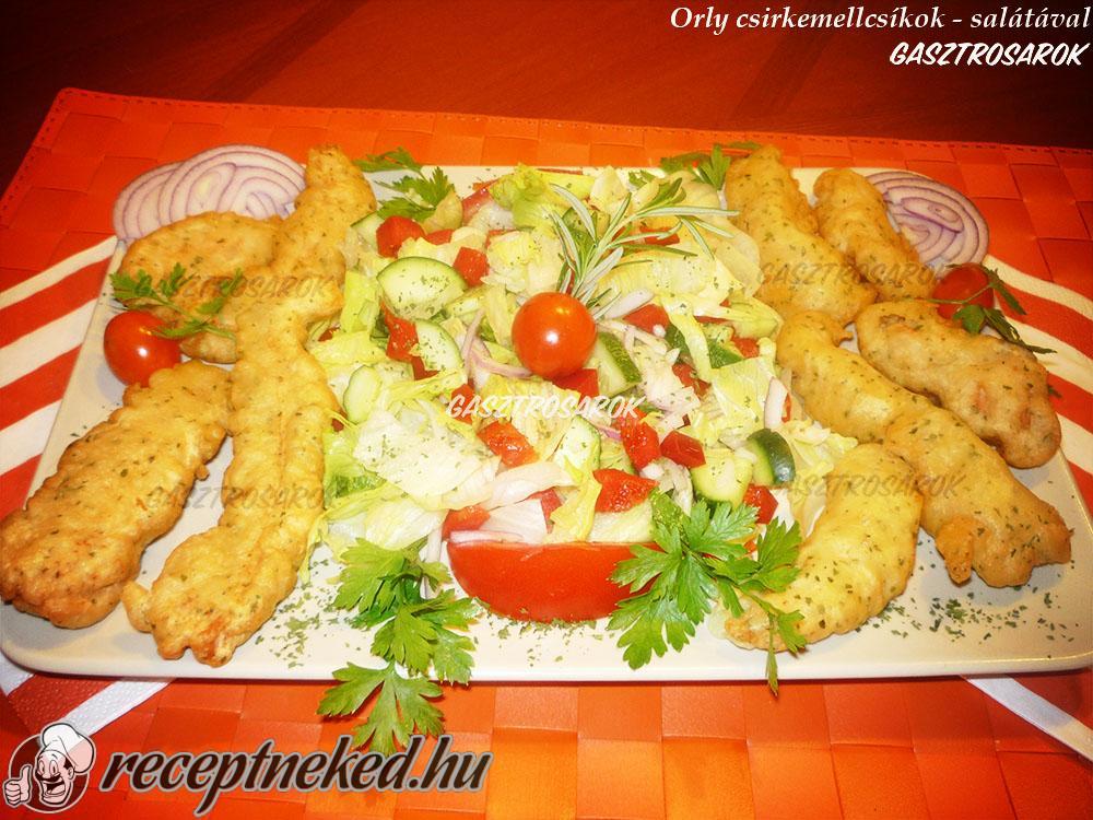 A csirkemellet vékony csíkokra vágjuk, fűszersóval fűszerezzük.