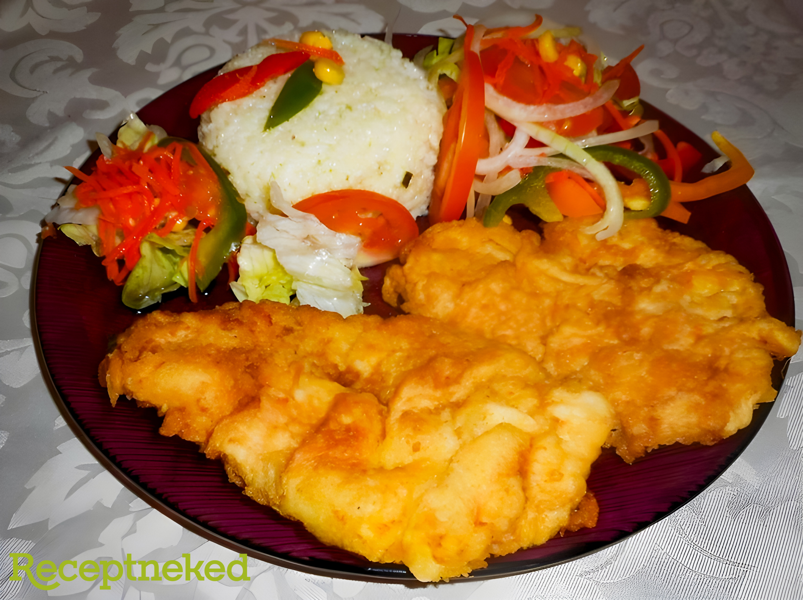 A csirkemellet felszeleteljük, kiklopfoljuk, sózzuk és borsozzuk.