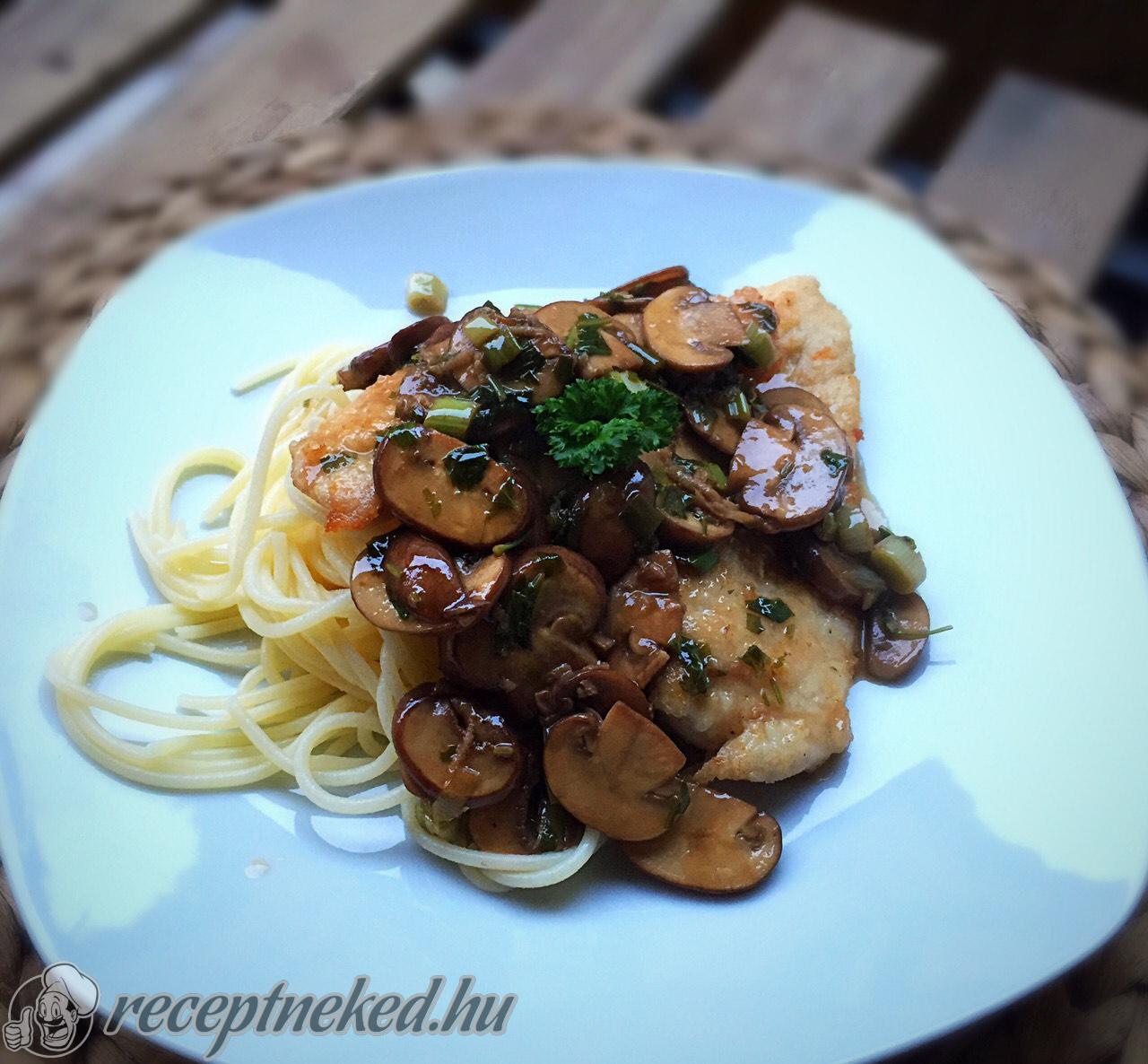 Az elkészült tésztát a húshoz keverjük, márványsajtot morzsolunk rá és tálaljuk.