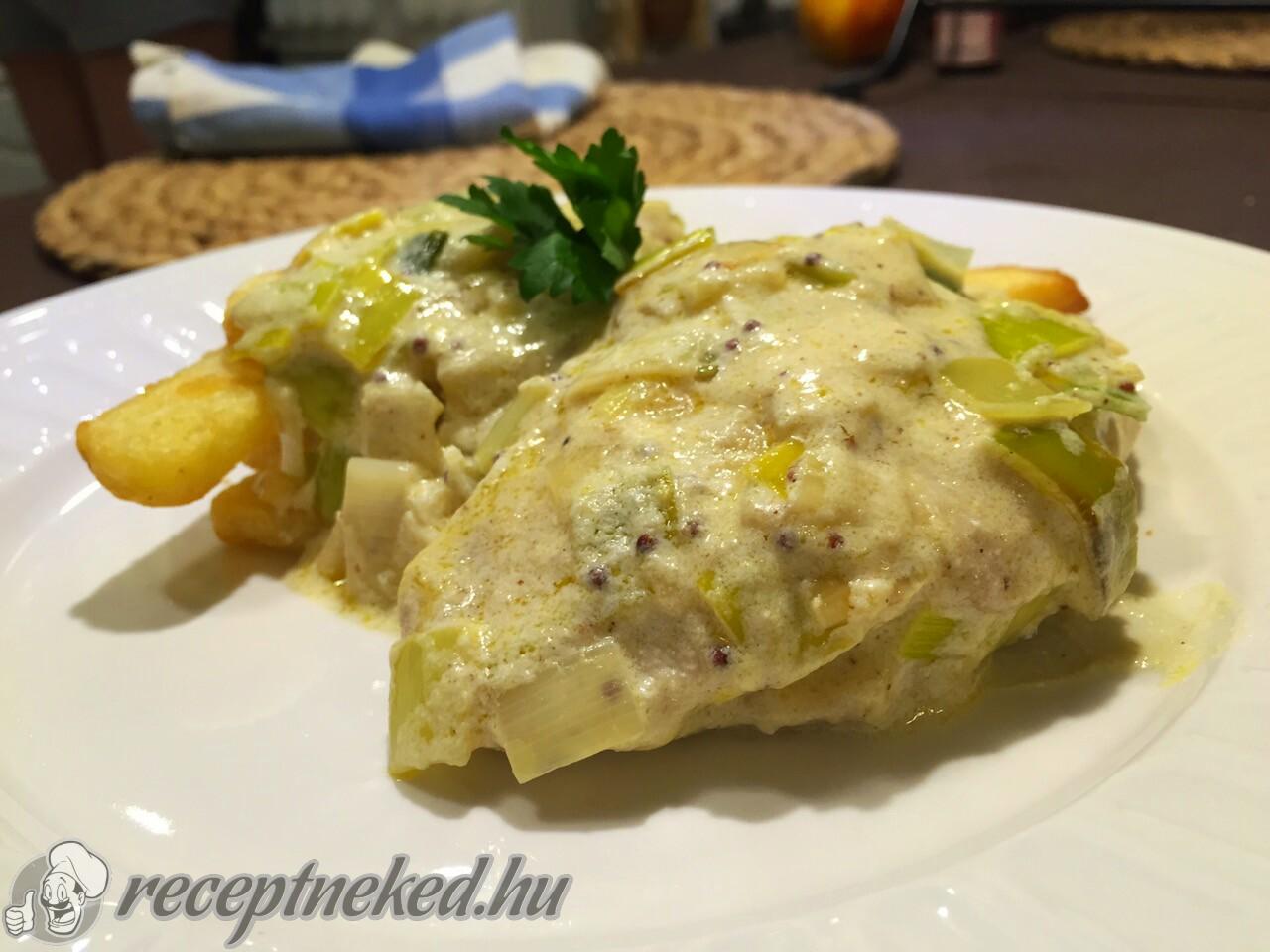 Ha a hús átsült, hozzáadjuk az aprított póréhagymát, a tejszínt, a vizet és a magos mustárt. Óvatosan elkeverjük, és takarék lángon addig főzzük, míg a szaft eléri a kellő sűrűséget.