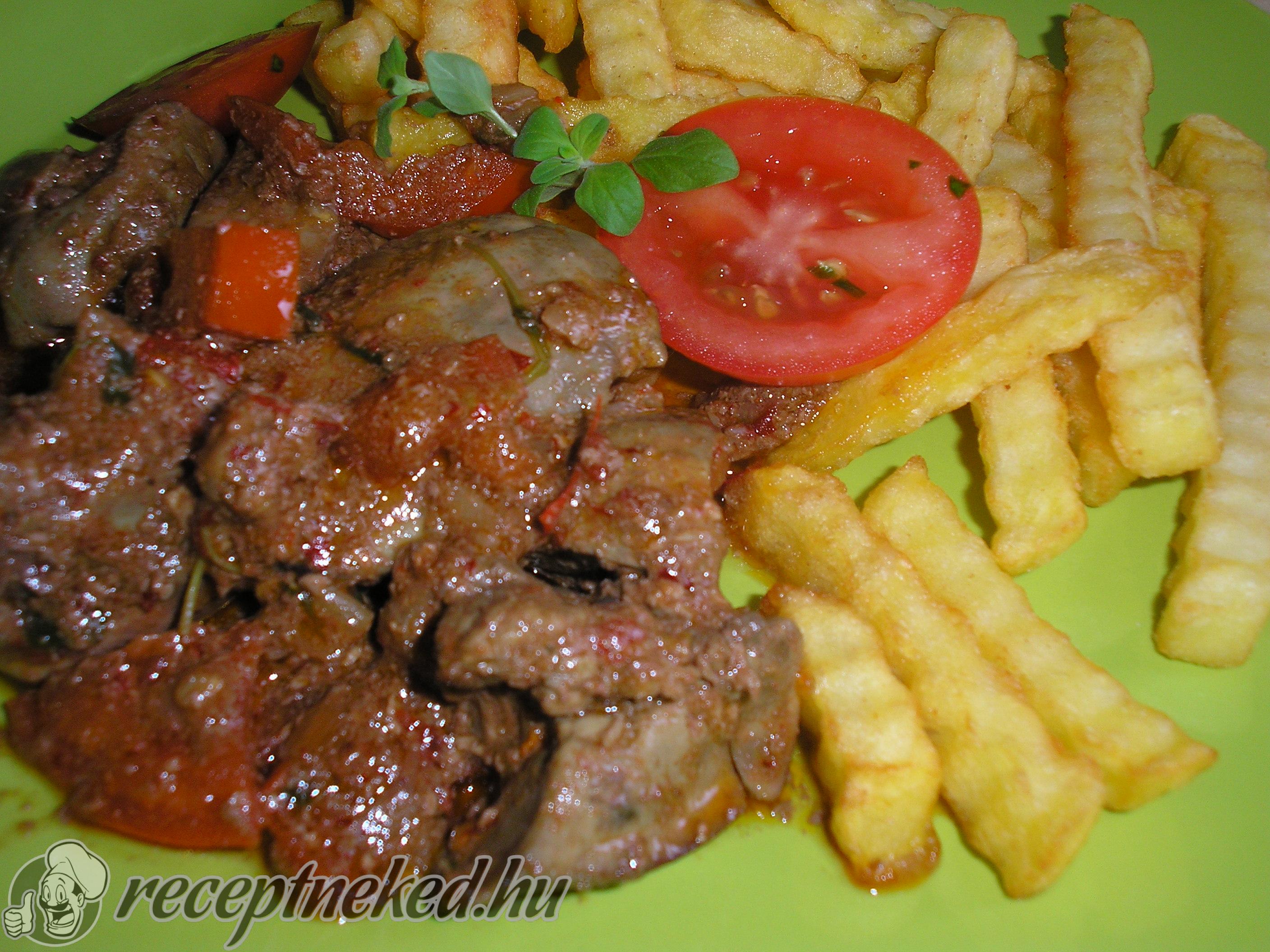 A paprikát, paradicsomot felkockázzuk, és azt is hozzáadjuk. Erős hőfokon pirítjuk, kevés vizet adjunk hozzá. Sózzuk, borsozzuk, és ha sűrűn szeretjük, akkor 1 tk liszttel szórjuk meg, hogy besűrűsödjön.