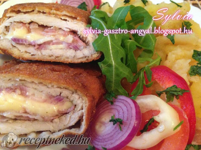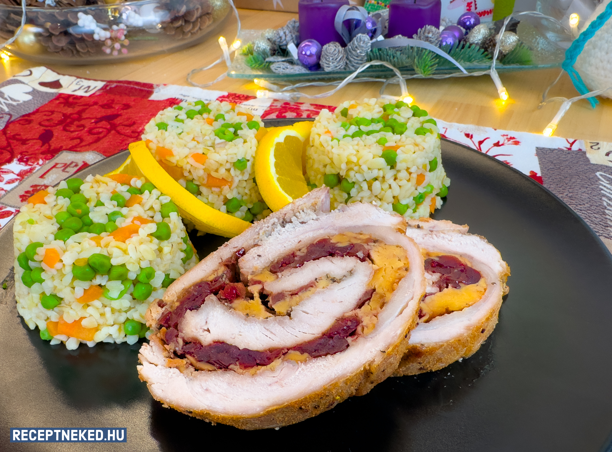Ezután helyezzük rá a hússzeletet, ízlés szerint szórjuk meg reszelt füstölt sajttal és aszalt áfonyával, majd a fólia segítségével tekerjük fel (én előző este elkészítettem a tekercseket, majd sütésig a hűtőben pihent).